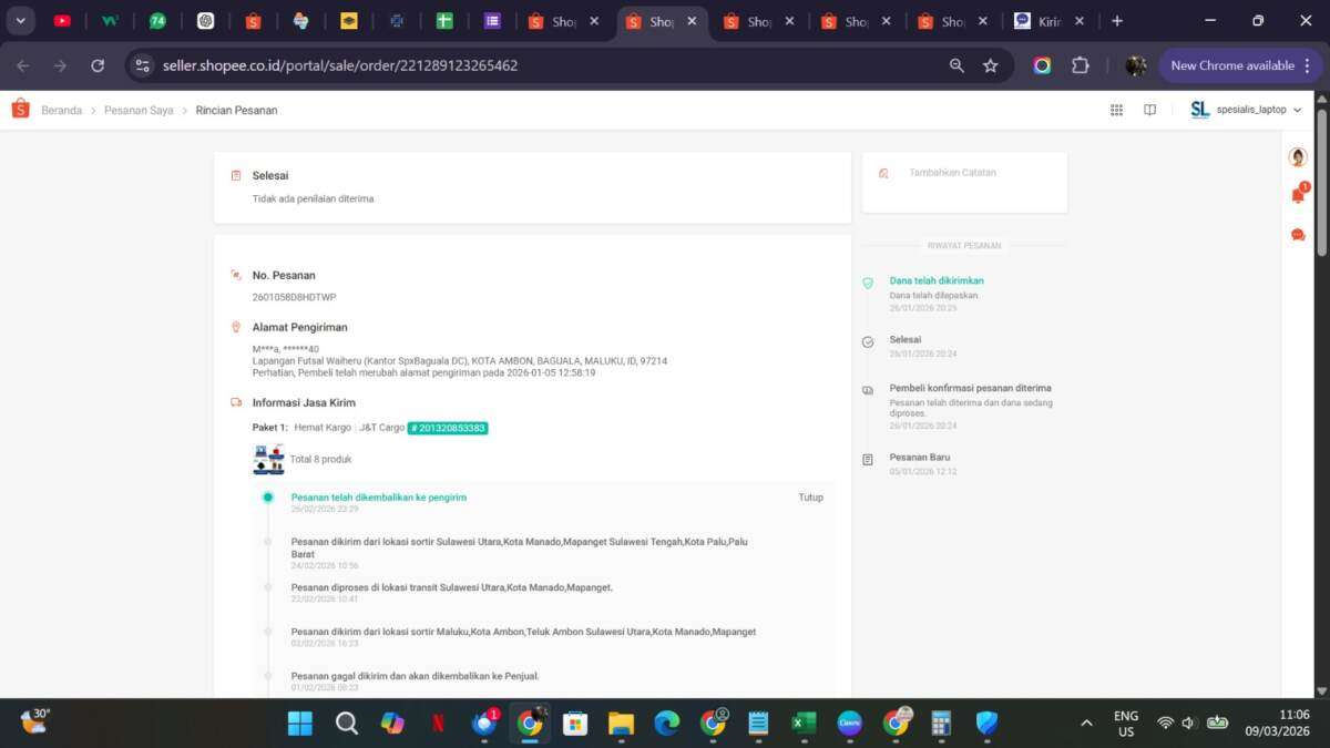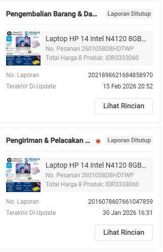 Pada tanggal 5 Januari 2026, ada satu pesanan laptop HP melalui Shopee, yang ditujukan untuk pengiriman ke Ambon, Kab. Baguala, Maluku. Dengan nomor resi J&T Cargo 201320853383, barang tersebut dikirim pada tanggal 6 Januari 2026. Status pelacakan pengiriman selalu diperbarui hingga tanggal 11 Januari 2026 pukul 17:48. Namun, pada tanggal 25 Januari 2026, ada update yang menyatakan bahwa pesanan gagal dikirim karena kendala operasional dan akan dikembalikan kepada penjual.