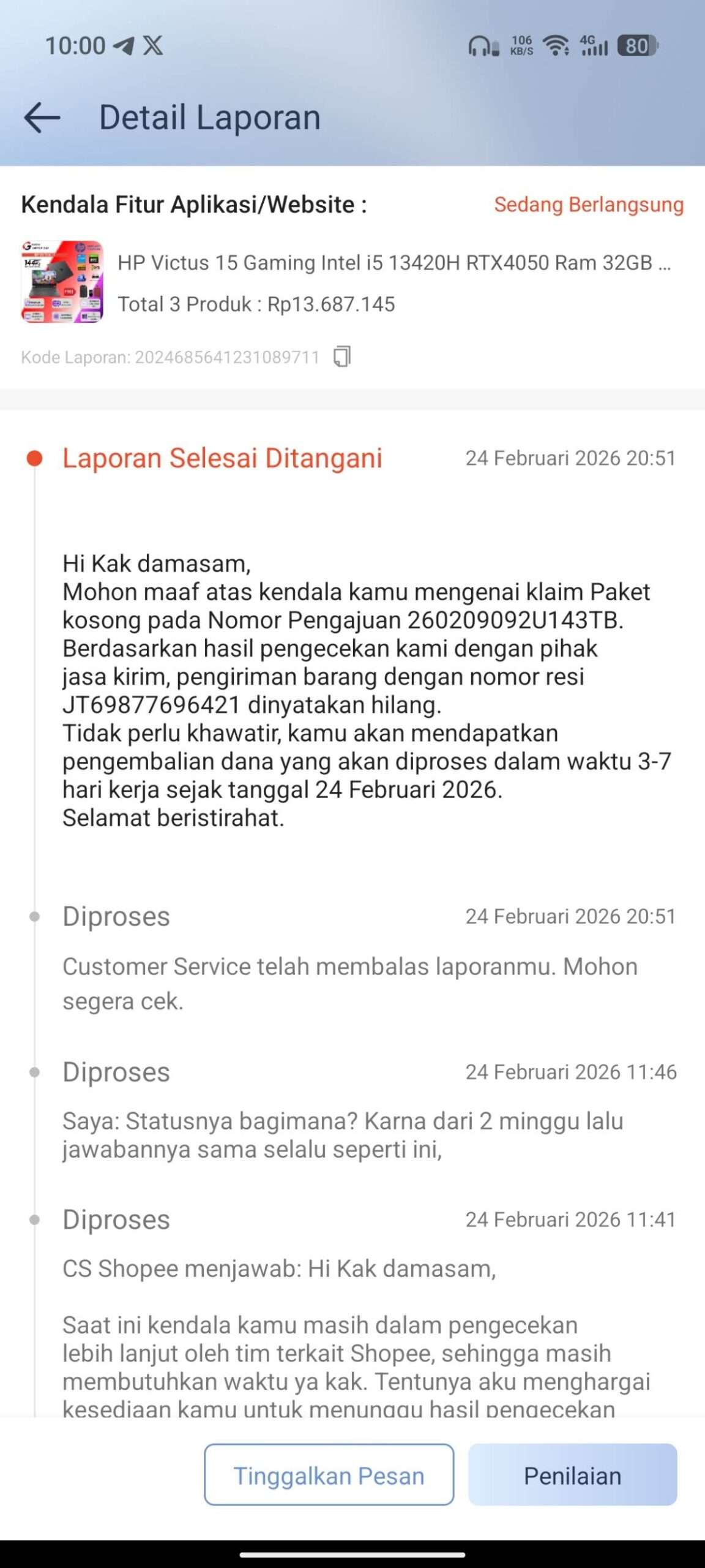 Saya berharap melalui pengaduan ini pihak Shopee dan JNE dapat segera memberikan kejelasan dan menyelesaikan permasalahan ini dengan mengembalikan dana pembelian sesuai nilai barang yang hilang.