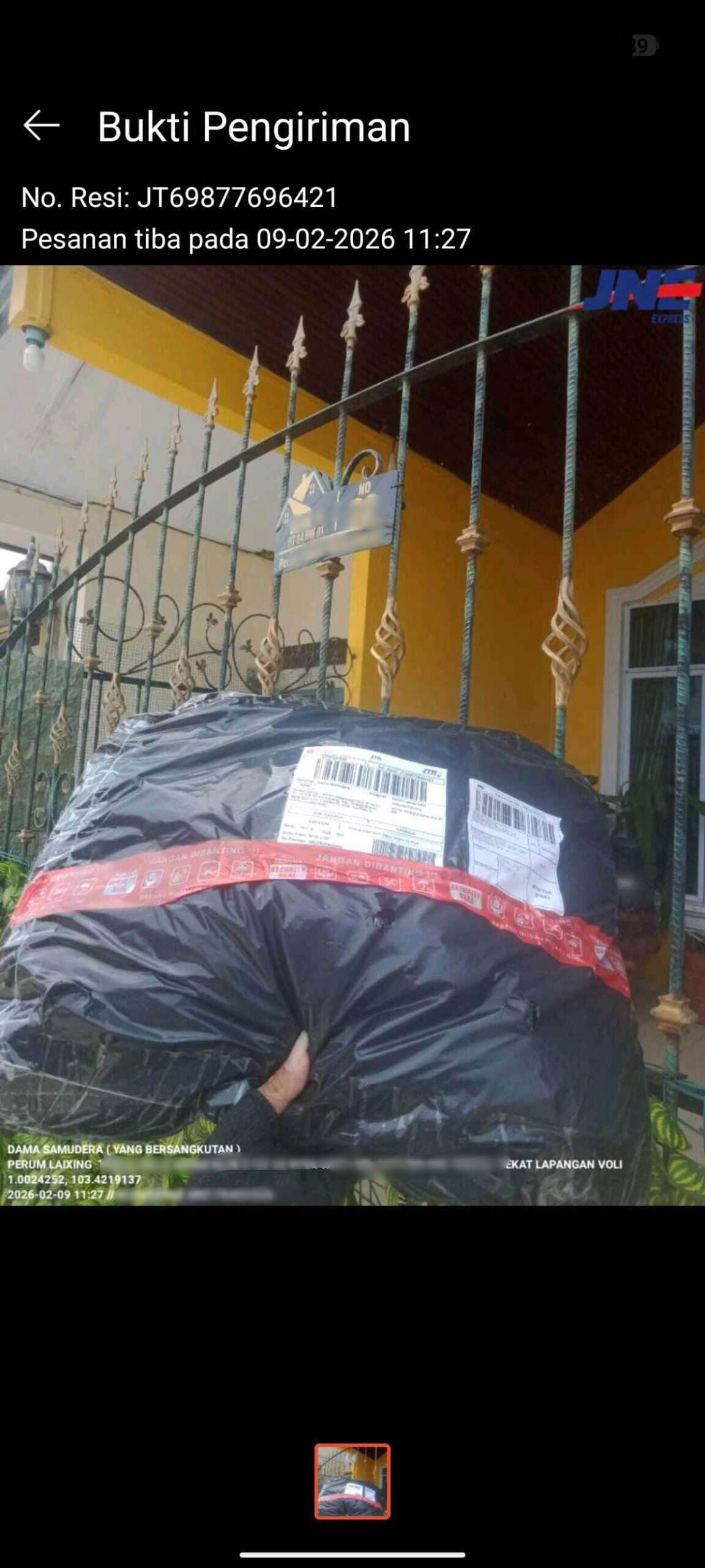 Pada tanggal 29 Januari 2026, saya melakukan pembelian sebuah laptop dengan nilai sekitar Rp14.000.000 melalui platform Shopee. Seller kemudian mengirimkan barang tersebut menggunakan jasa pengiriman JNE dengan nomor resi JT69877696421. Paket sampai tanggal 9 Februari.