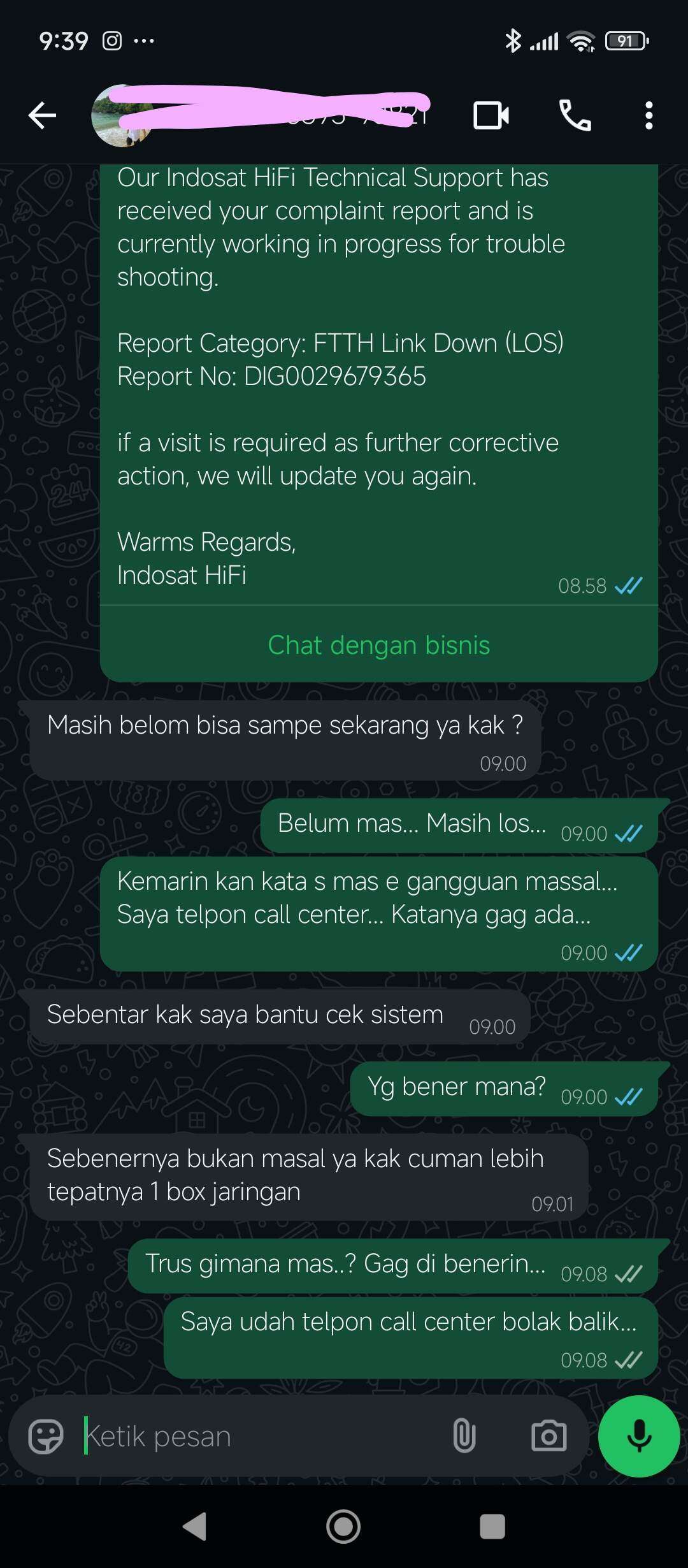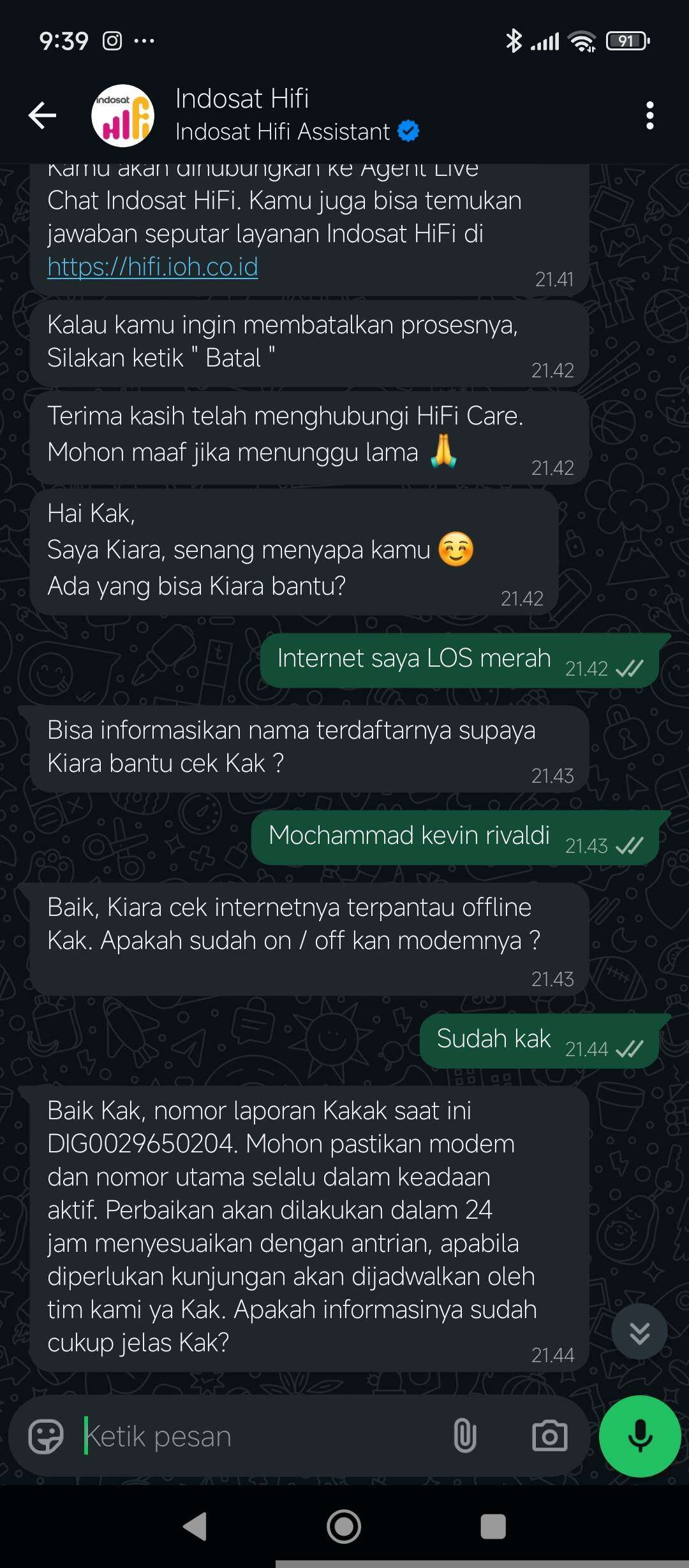 Saya adalah pelanggan Indosat HiFi. Sudah tiga hari ini internet di rumah kakak saya bermasalah (LOS merah). Saya sudah menghubungi call center, tetapi jawaban yang diberikan selalu sama dan tidak ada kunjungan dari teknisi.