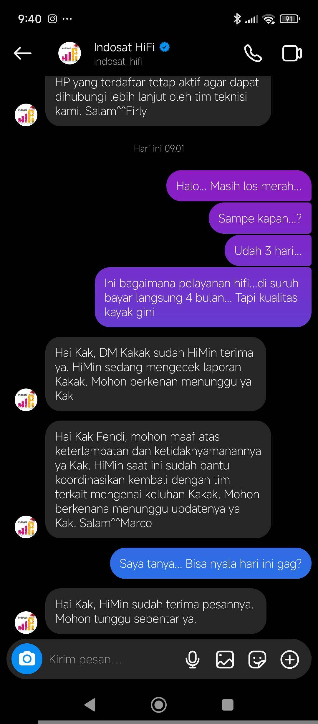 Saya sudah menghubungi berbagai saluran CS Indosat HiFi, tetapi jawaban yang saya terima selalu meminta saya untuk menunggu dan akan dipercepat, tetapi tidak pernah ada teknisi yang datang. Padahal, saya sudah membayar untuk empat bulan ke depan. Bagaimana ini, kok layanan Indosat HiFi malah lebih bagus saat dulu masih bernama MNC Play?