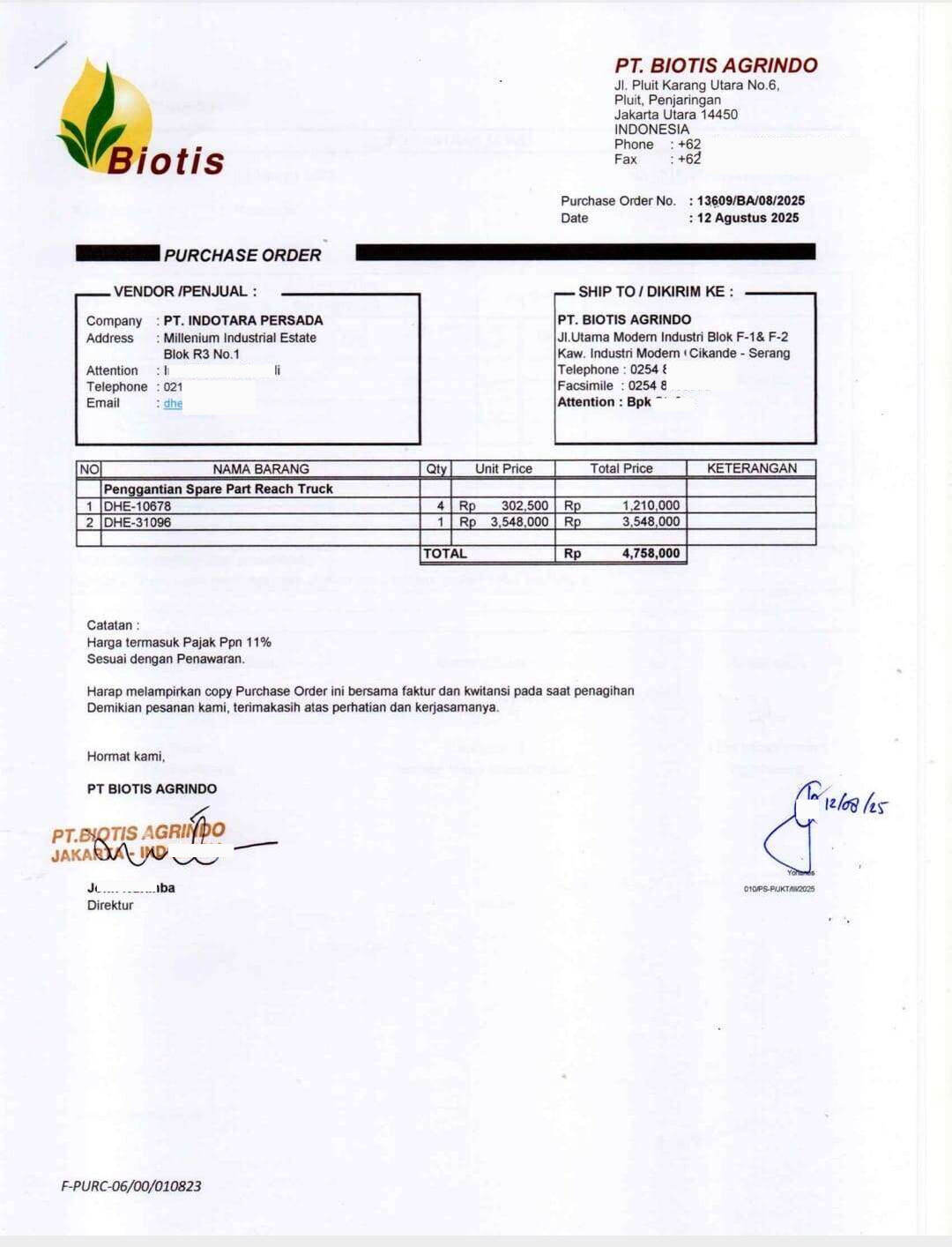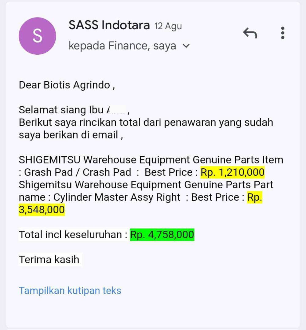 Sampai tanggal 12 Agustus 2025, barulah kami diinformasikan bahwa ada beberapa part yang harus diganti dan diberikan penawaran harganya. Pada hari itu juga, kami langsung membuat purchase order dan melakukan pembayaran sesuai penawaran sebesar Rp4.758.000, karena kondisi di pabrik kami sangat mendesak.