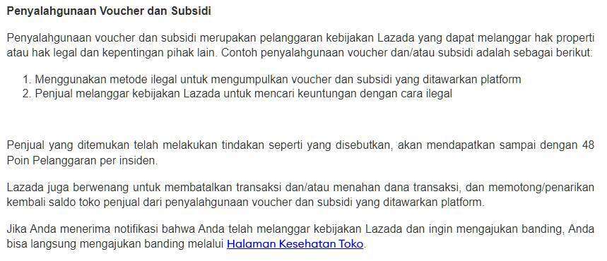 Kami ingin menekankan bahwa pelanggaran terkait penyalahgunaan voucher dan subsidi merupakan pelanggaran kebijakan Lazada yang dapat melanggar hak properti atau hak legal dan kepentingan pihak lain. Praktek ini termasuk menggunakan metode illegal dalam pengumpulan voucher/subsidi yang ditawarkan untuk mendapatkan keuntungan.