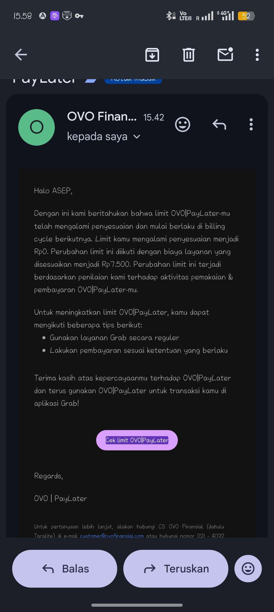Tanggal 24 November 2025, saya menerima email dari pihak OVO Finansial yang menyatakan bahwa limit OVO PayLater saya menjadi 0 rupiah dengan biaya layanan sebesar Rp7.500 (email saya lampirkan).