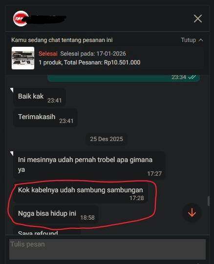 Secara teknis, kerusakan ini hanya bisa dilakukan melalui pembongkaran bodi mesin. Namun, Shopee secara tidak logis menolak banding saya pada 17 Januari 2026 dengan alasan “kemasan tidak sesuai panduan jasa kirim”.