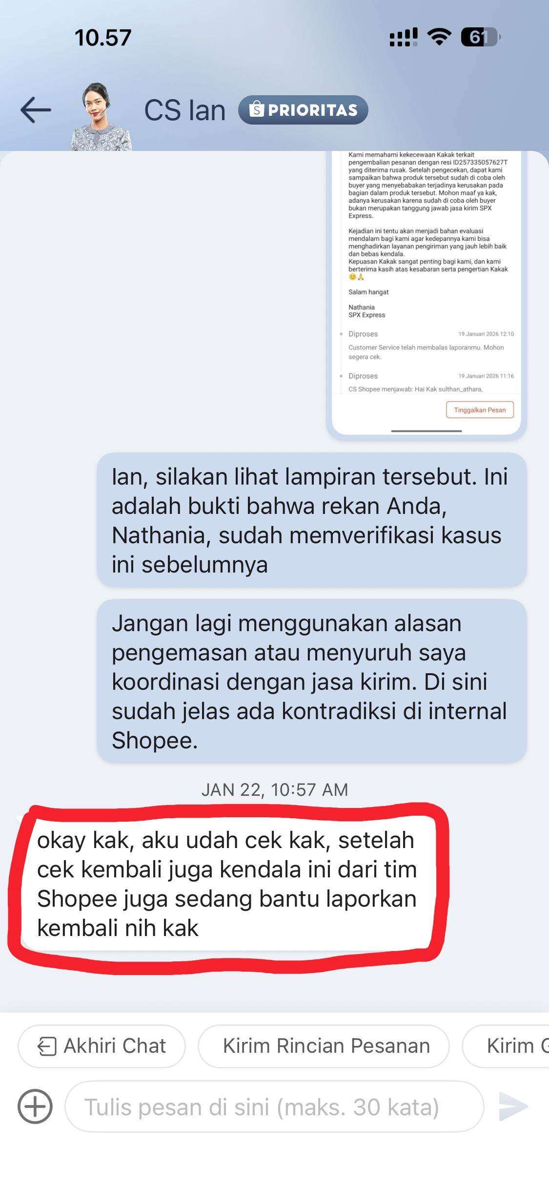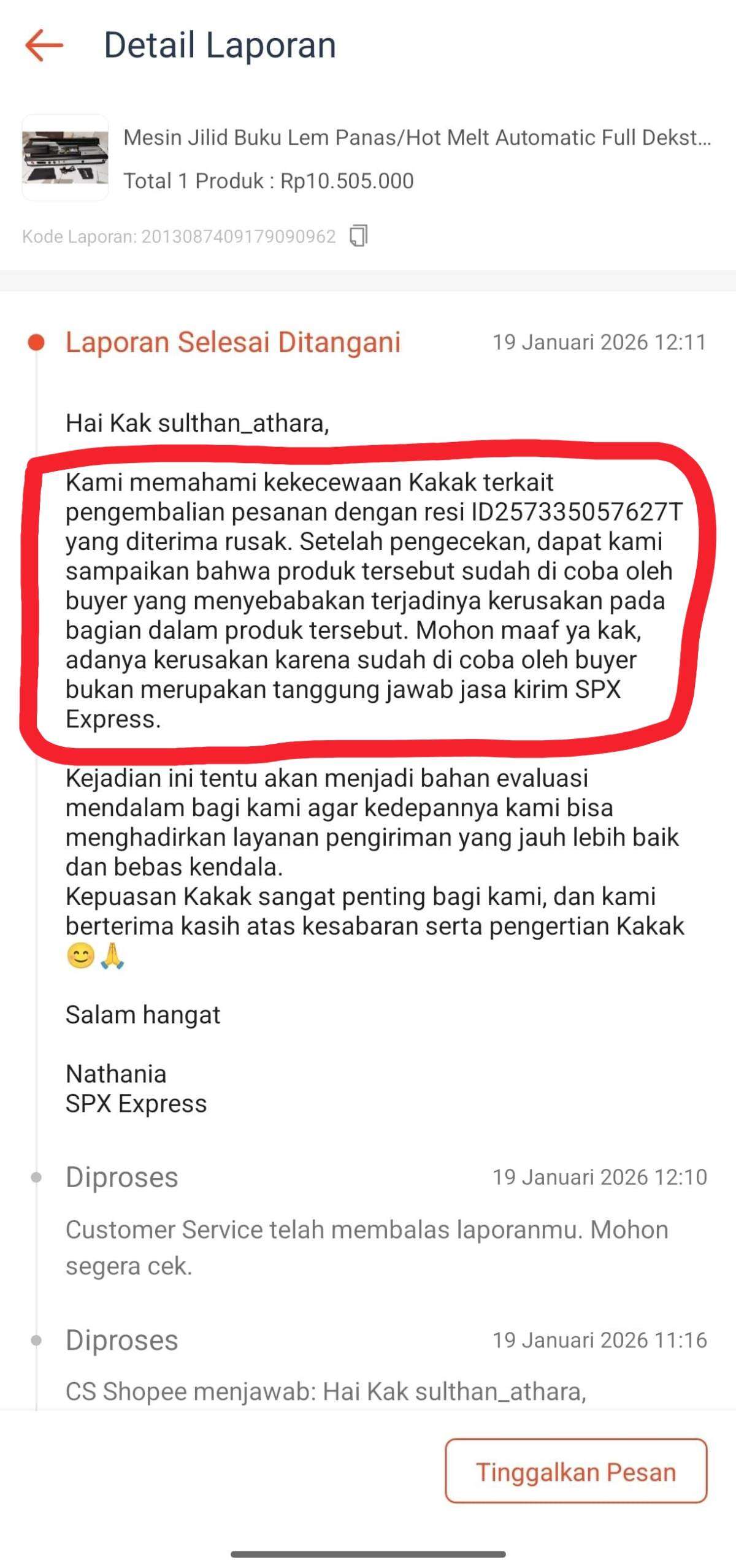 19 Januari 2026: Agen SPX (Nat***a) mengonfirmasi secara tertulis bahwa benar terjadi pengrusakan oleh pembeli.
