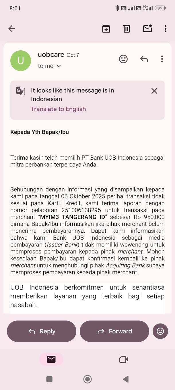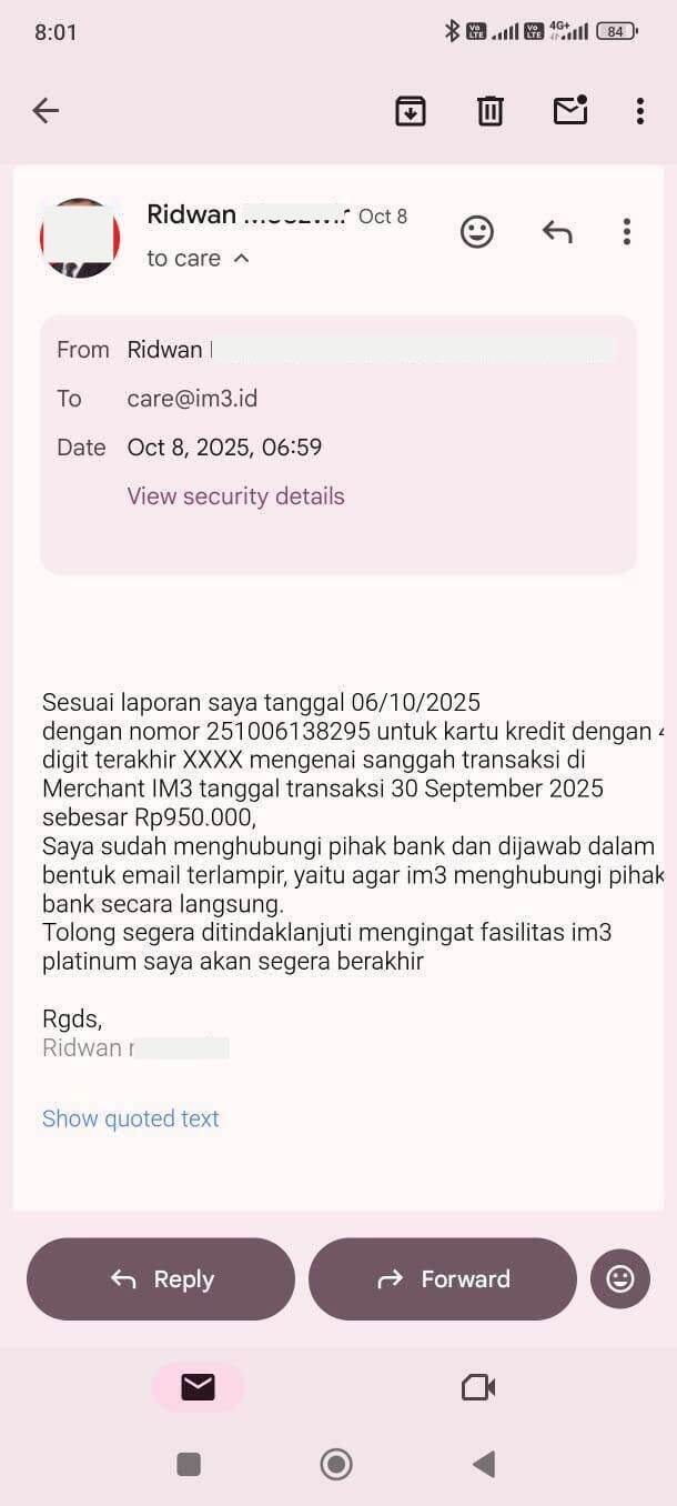 Komplain saya terus berlanjut melalui email, baik kepada pihak IM3 (terakhir pada tanggal 18 November 2025 dan belum ada tanggapan sampai sekarang), maupun kepada pihak Bank UOB sesuai dengan email terakhir pada tanggal 20 November 2025, dan selalu dijawab oleh bank UOB bahwa kasus akan diproses dalam waktu 30 – 120 hari kerja (sungguh menggelikan). Sekali lagi, menurut saya, kondisi ini terjadi karena kurangnya keseriusan dalam menangani masalah yang hanya ditangani oleh petugas front liner front liner (customer service) junior.