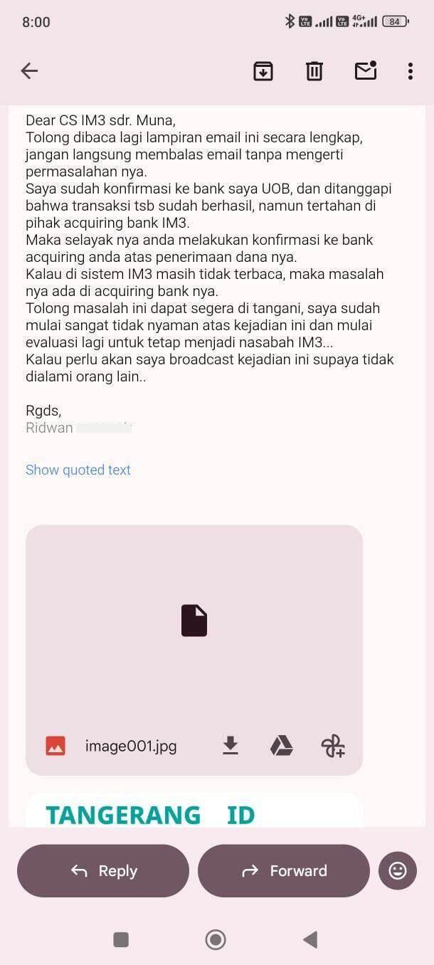 Karena penanganan masalah ini tidak memuaskan, saya juga mengajukan komplain melalui email ke care@im3.id, tetapi tanggapannya tetap tidak memuaskan. Menurut saya, hal ini disebabkan oleh kurangnya keseriusan dalam menangani masalah yang hanya ditangani oleh petugas front liner (customer service) junior. Saya juga telah memberikan peringatan kepada pihak IM3 untuk menyebarluaskan masalah ini, jika tidak ditangani dengan serius. Agar kejadian serupa tidak menimpa pelanggan lain.