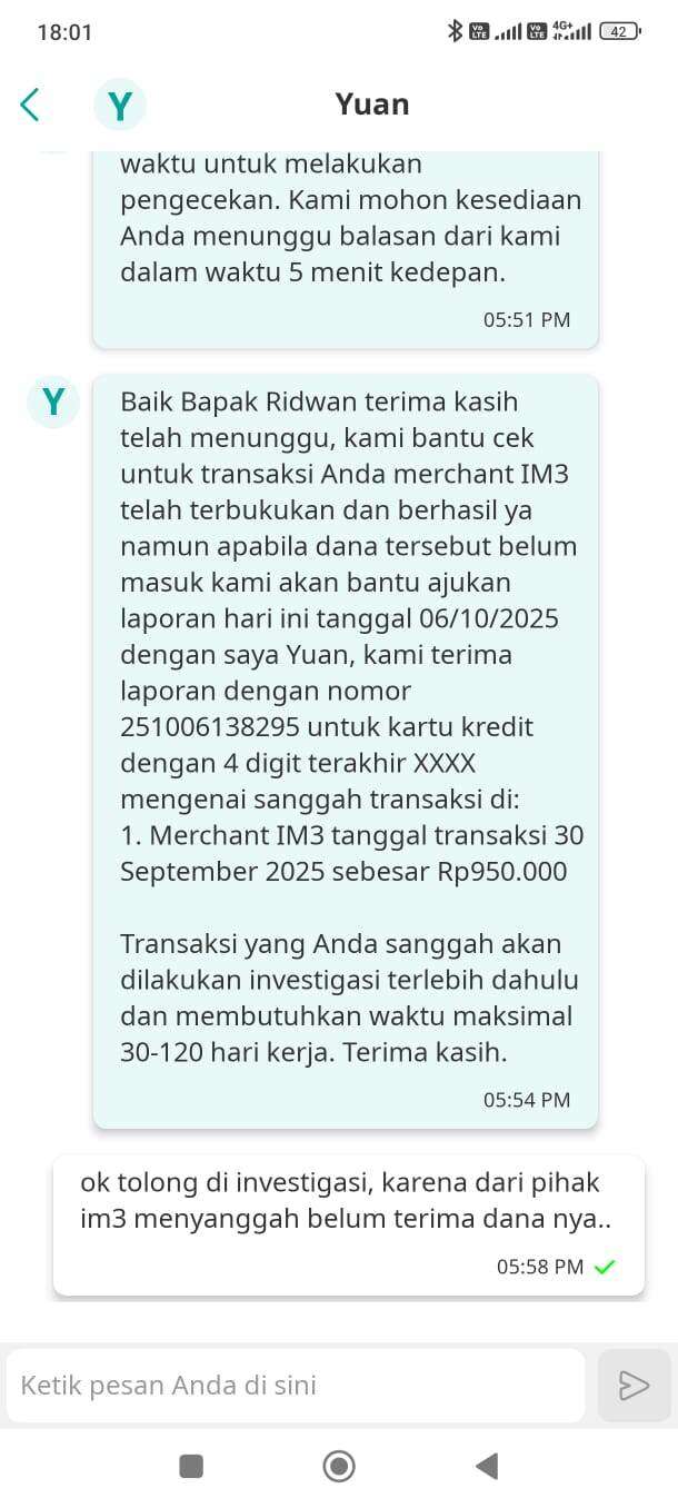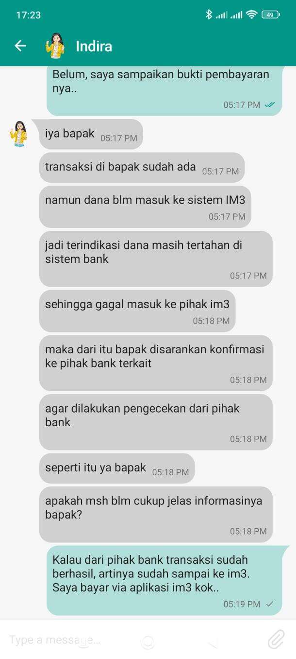 Saya berulang kali diberi tahu bahwa transaksi saya tidak berhasil oleh pihak IM3, sementara tagihan di kartu kredit tetap berjalan. Saya diminta untuk menghubungi pihak Bank UOB, karena transaksi tidak berhasil di pihak IM3. Saya juga menegaskan bahwa pembayaran melalui kartu kredit sudah berhasil, dan ini didukung oleh tanggapan dari pihak Bank UOB yang menyatakan bahwa transaksi tersebut sudah berhasil di pihak bank. Saya juga menyampaikan tanggapan pihak bank kepada pihak IM3.