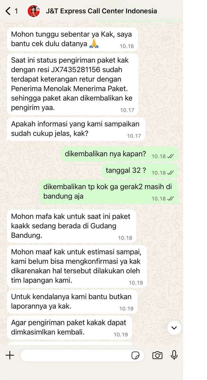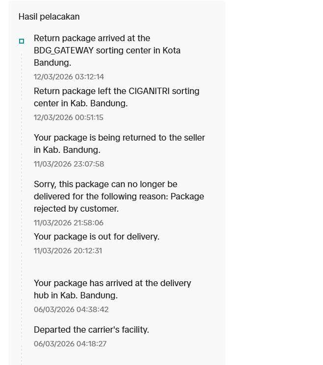 Akan tetapi anehnya, baru tanggal 11 Maret 2026 paket tersebut diantar ke penerima. Karena kemungkinan penerima marah karena paketnya tidak diterima, penerima menolak paket tersebut. Di sini saya sudah dirugikan karena JNT Express, akan tetapi saya masih bisa maklum dan menahan diri. Setidaknya paket saya akan kembali lagi ke saya.
