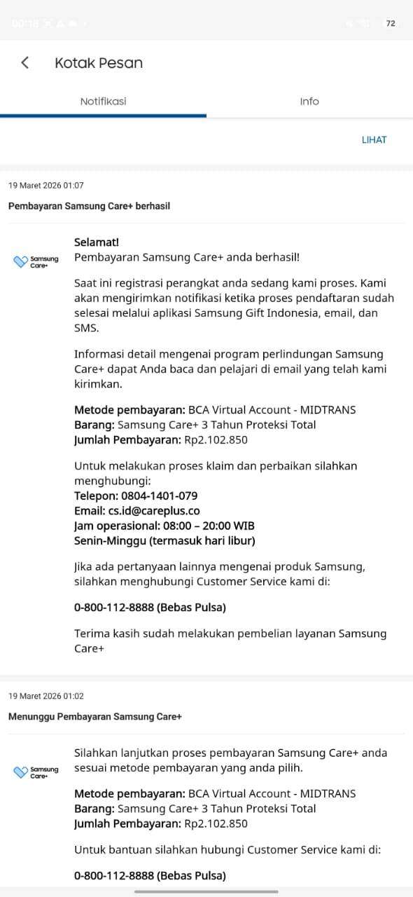 Setelah mempertimbangkan beberapa hal, saya mencoba membeli Samsung Care+ pada tanggal 19 Maret 2026 pukul 01.02. Ternyata harganya berbeda dengan yang dijanjikan oleh Samsung. Saya coba mendaftar melalui website Samsung, tetapi tidak bisa. Saat itu saya panik, khawatir sudah tidak bisa mendaftar Samsung Care+. Akhirnya saya memutuskan membeli Samsung Care+ seharga Rp2.099.000 terlebih dahulu agar tidak kehabisan kesempatan.