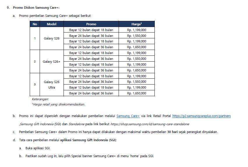“c. Pembelian Samsung Care+ dalam promo ini hanya dapat dilakukan dengan maksimal waktu pembelian 30 hari sejak perangkat dinyalakan.”