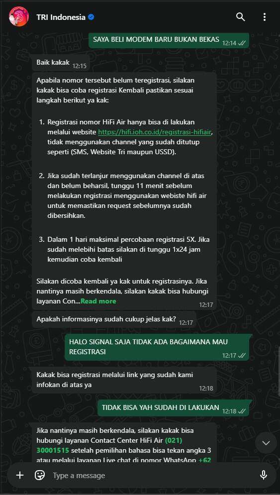 Entah berapa lama lagi saya akan mendapatkan jawaban, tetapi tidak ada itikad baik dan tindakan dari mereka, hanya masalah kartu yang sudah dinyatakan hangus oleh pihak Tri. Padahal, jelas di kemasan modem tertulis bahwa kartu tersebut berlaku hingga 30 Desember 2027. Bukankah sekarang masih tahun 2026? Kenapa sudah No Network?
