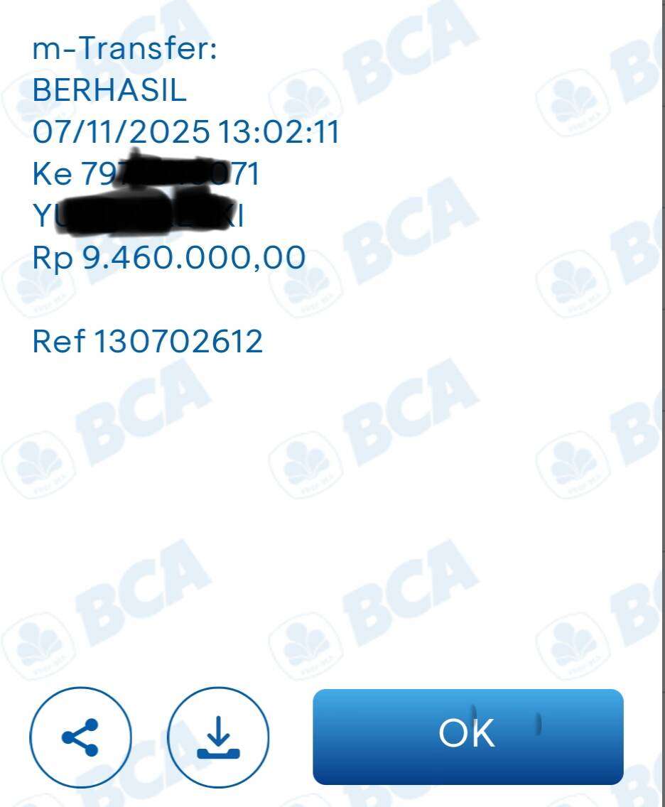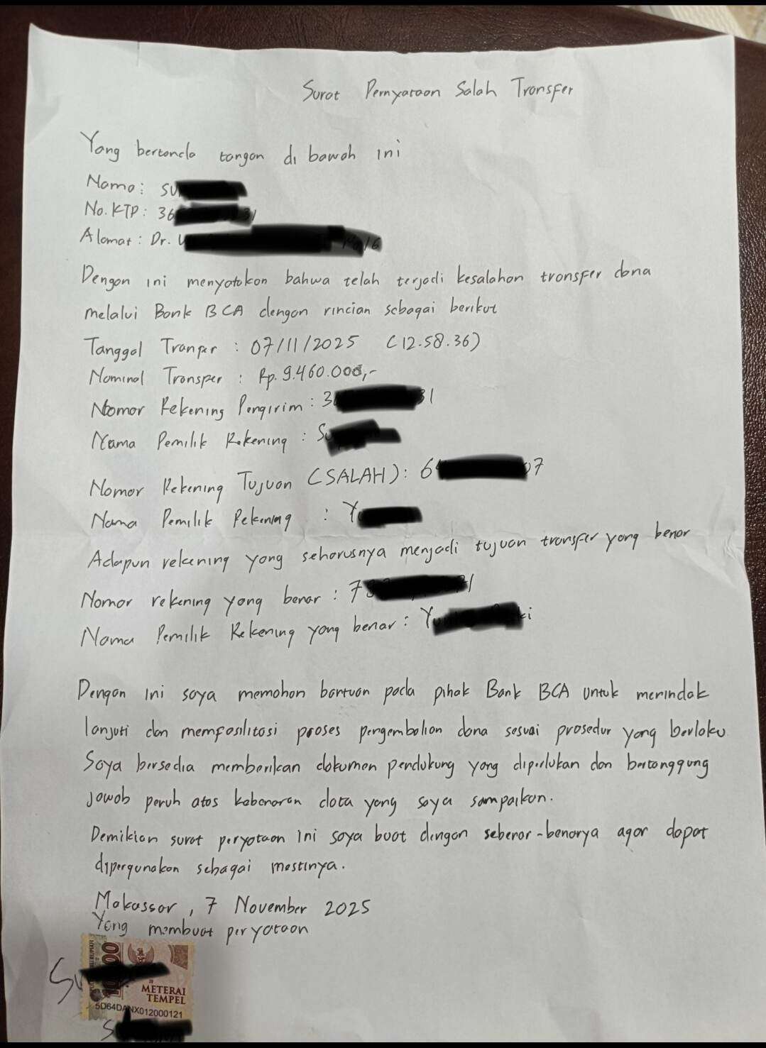 Pada tanggal 7 November 2025, saya mengalami kesalahan saat melakukan transfer antarrekening BCA sebesar Rp9.460.000 ke nomor rekening 645022**07 atas nama Y***. Seharusnya, transfer tersebut ditujukan ke rekening 797071**71 atas nama Y*** R****.