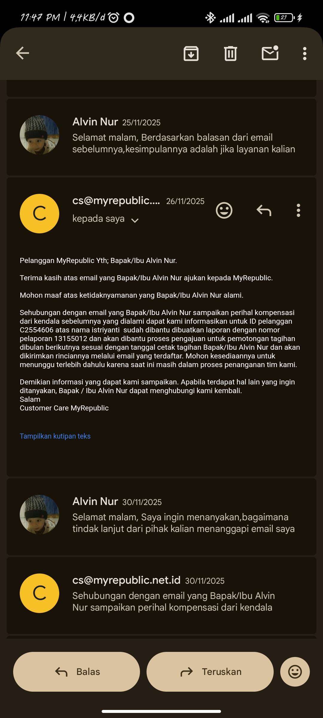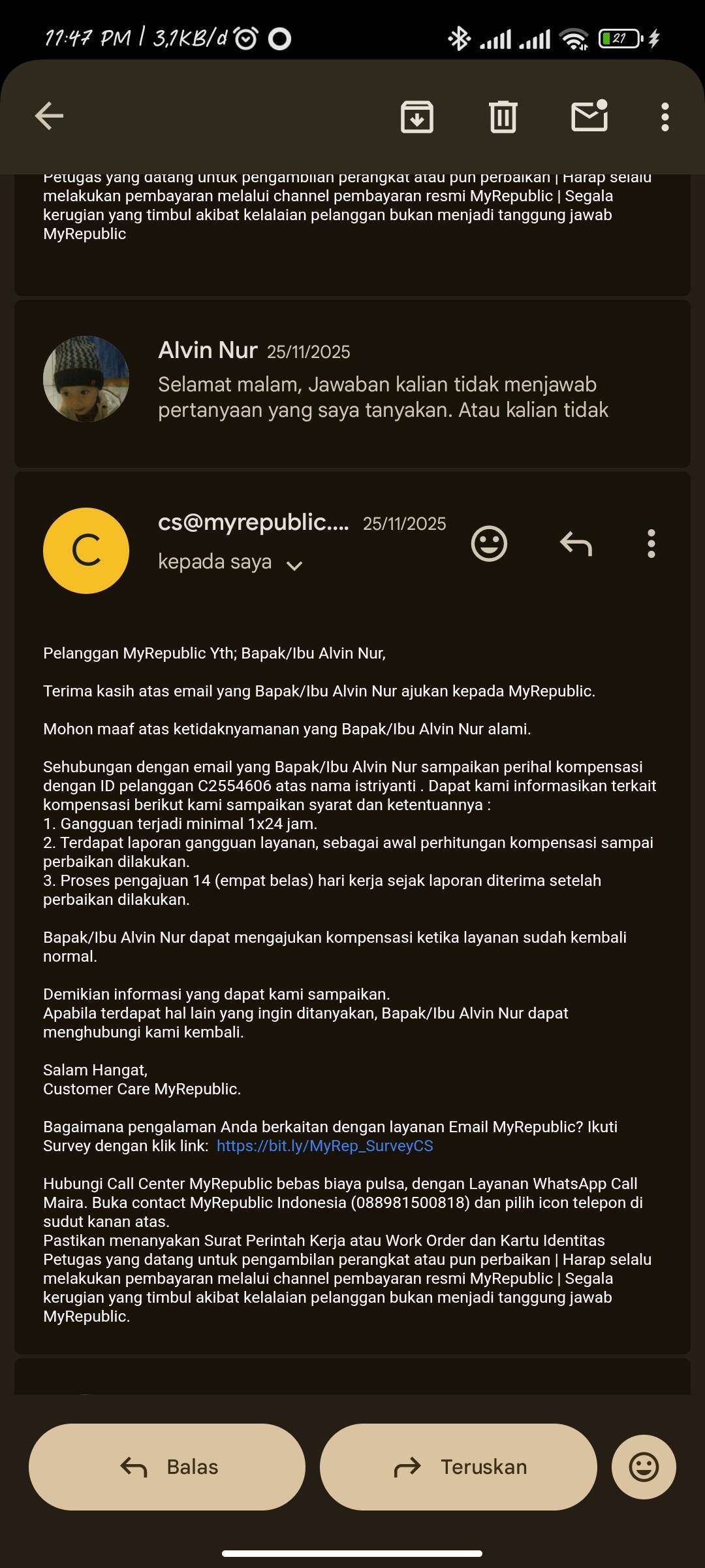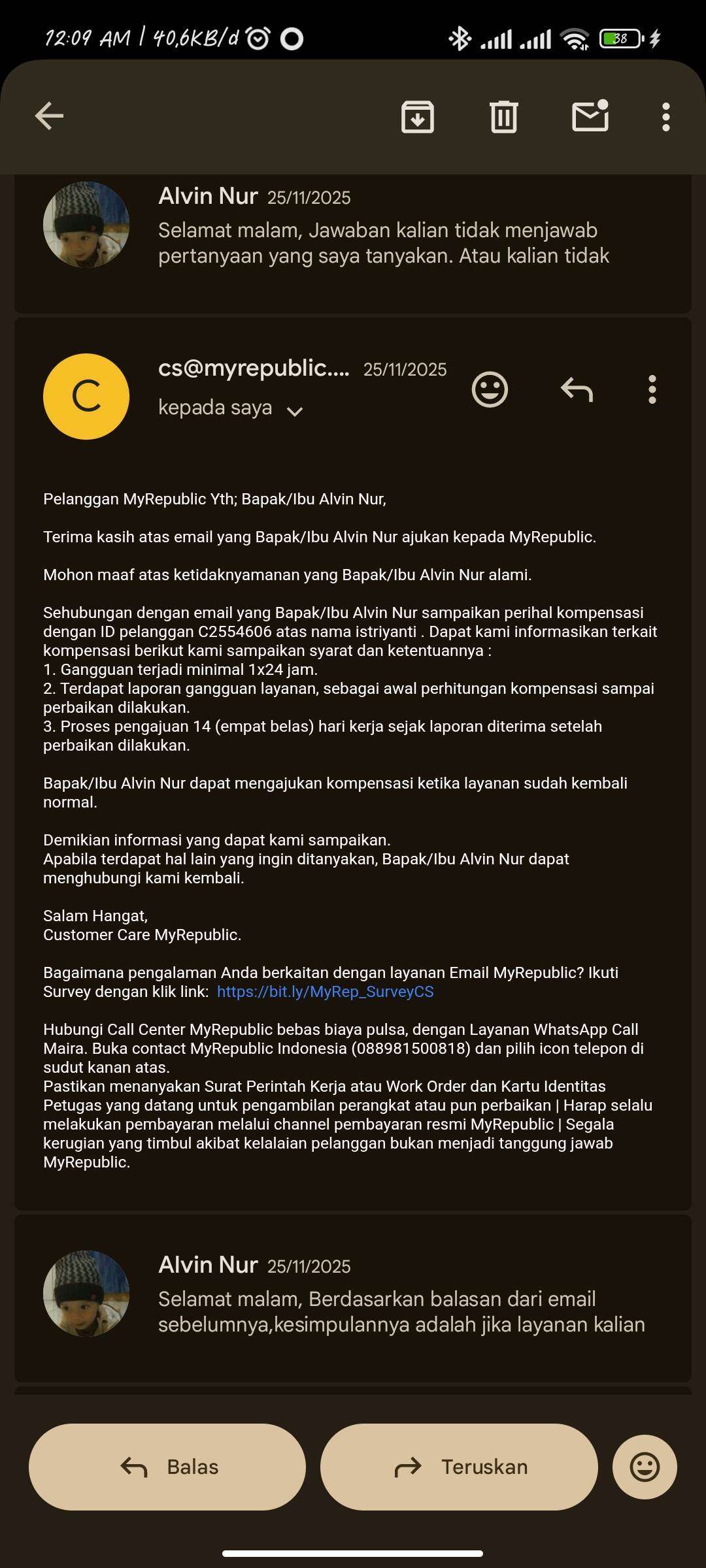 Jawaban dari MyRepublic hanya berupa template. Laporan sudah dibuat dan akan diteruskan kepada tim terkait, tetapi hingga satu bulan tidak ada jawaban apapun dari mereka. Yang ada hanya beberapa email pemberitahuan tentang gangguan jaringan dan tagihan, serta peringatan denda jika terlambat membayar.