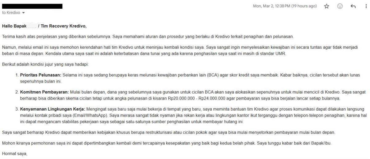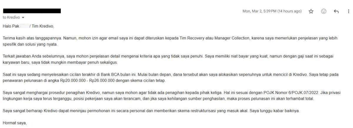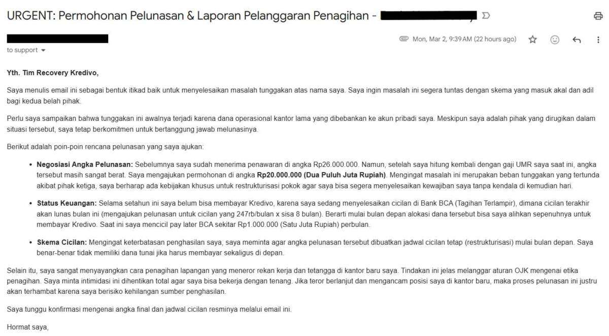 Melalui surat ini, saya meminta manajemen Kredivo untuk menghentikan teror ke lingkungan kerja saya dan memberikan solusi pelunasan yang manusiawi sesuai kemampuan finansial saya. Saya siap bayar, tapi mohon berikan skema yang masuk akal.