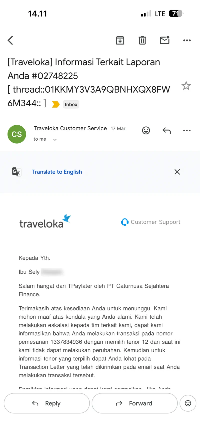 Saya sudah menyampaikan niat untuk membayar lunas. Namun CS bernama Nab** menyatakan hal tersebut tidak bisa dilakukan dan saya tetap harus mengikuti skema tenor 12 bulan. Saya kemudian dieskalasikan melalui email kepada bagian manajemen Traveloka PayLater, dan hasil investigasi diterima pada tanggal 17 Maret 2026 pukul 03.27. Hasilnya tidak ada perubahan sama sekali — pihak Traveloka tetap menyatakan bahwa saya memilih tenor 12 bulan pada saat transaksi.