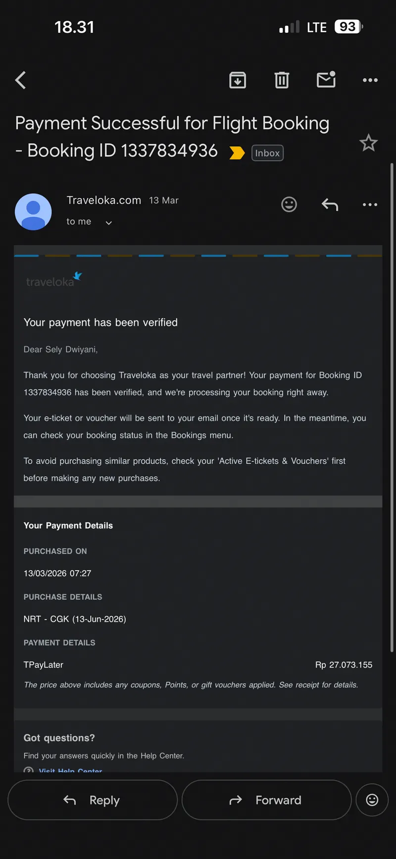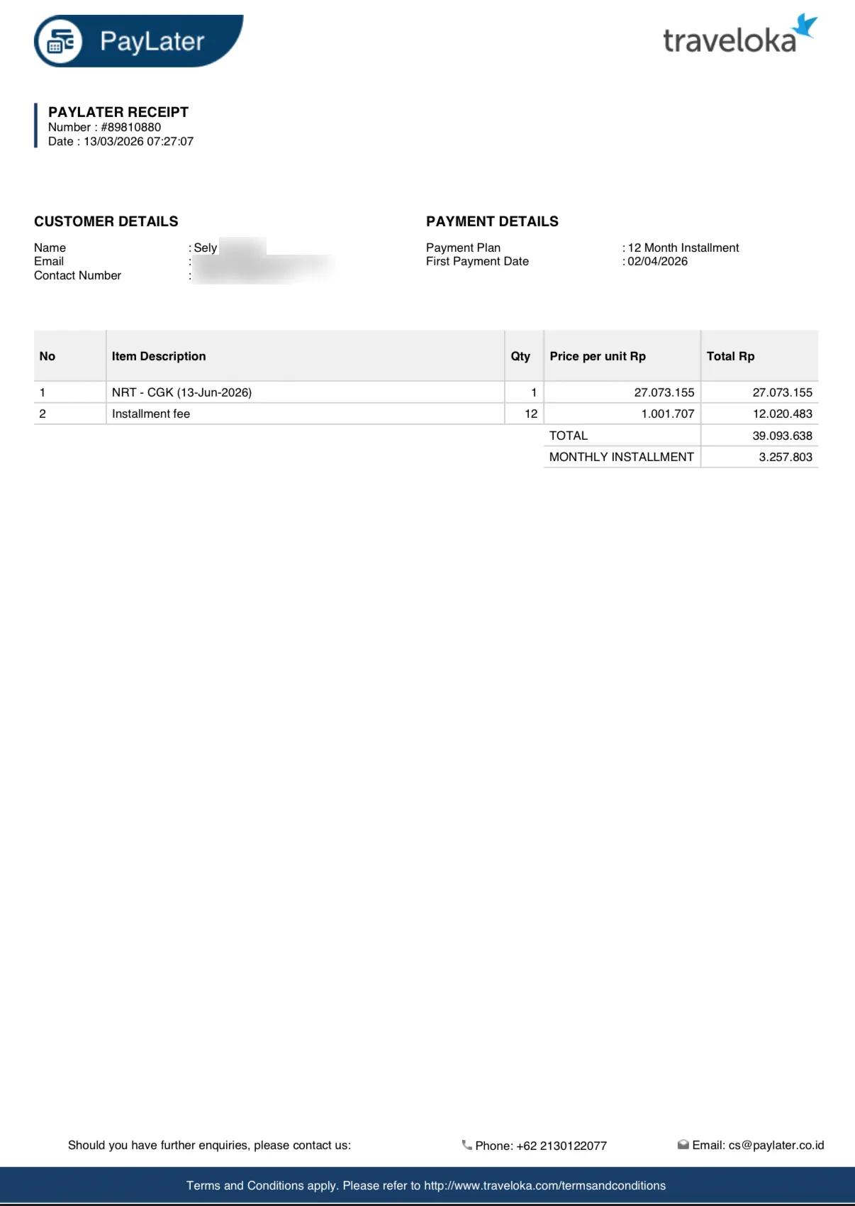 Pada tanggal 13 Maret 2026, saya melakukan pembelian tiket penerbangan tujuan Jepang–Jakarta menggunakan fasilitas Traveloka PayLater. Pada saat transaksi, saya dengan sadar memilih tenor 1 bulan dengan total tagihan sebesar Rp27.073.155.