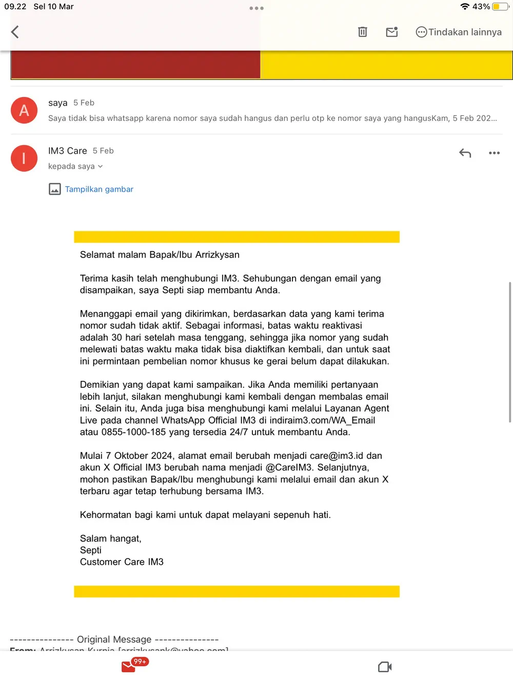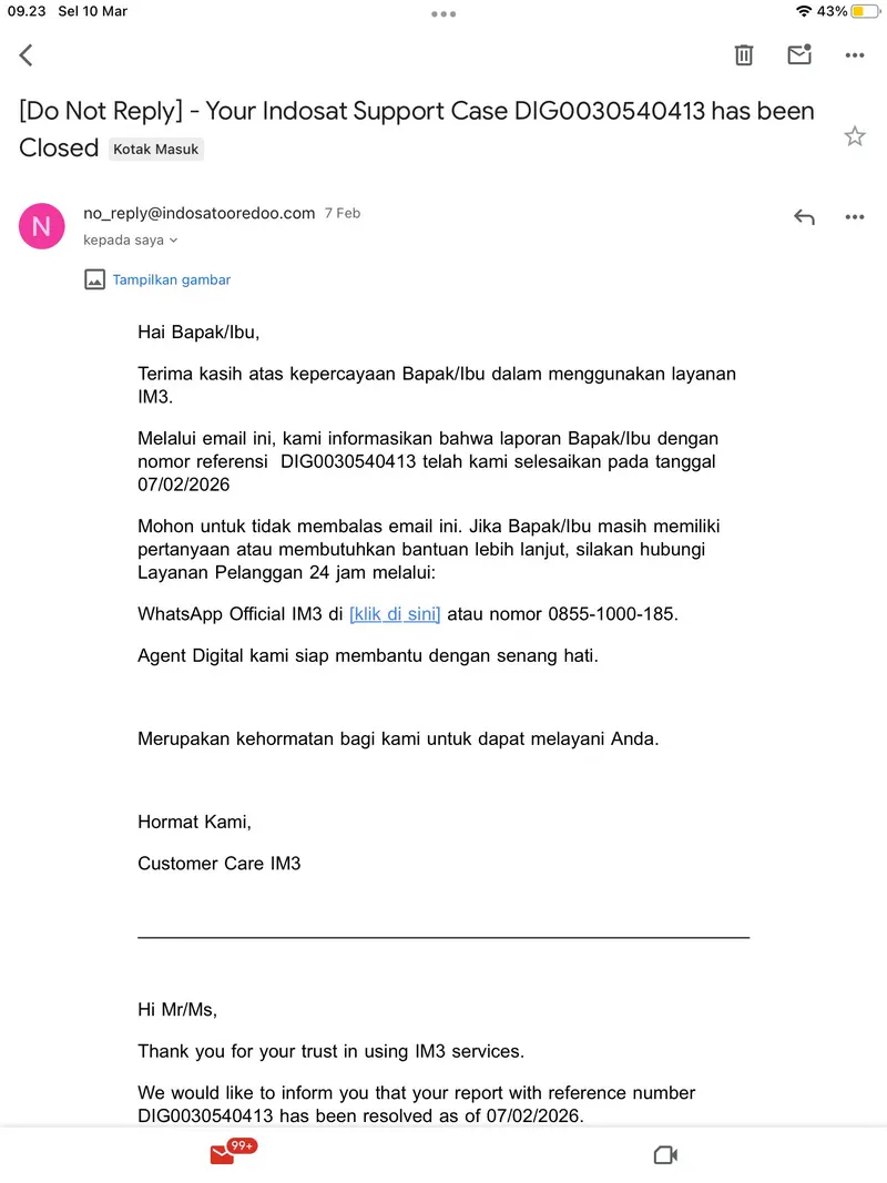 Pada bulan Januari 2026, saya berinisiatif datang ke gerai Indosat di Supermal Karawaci dan juga Lippo Mall Puri untuk meminta tolong mengaktifkan kembali nomor saya tersebut. Namun, dari penjelasan petugas yang melayani, nomor saya itu katanya hanya bisa diaktifkan kembali dengan syarat wajib migrasi menjadi pelanggan pascabayar (Indosat IM3 Platinum). Biaya berlangganannya pun dipatok dengan komitmen 3 bulan seharga Rp315.000. Nomor pelaporan: DIG0030540413.