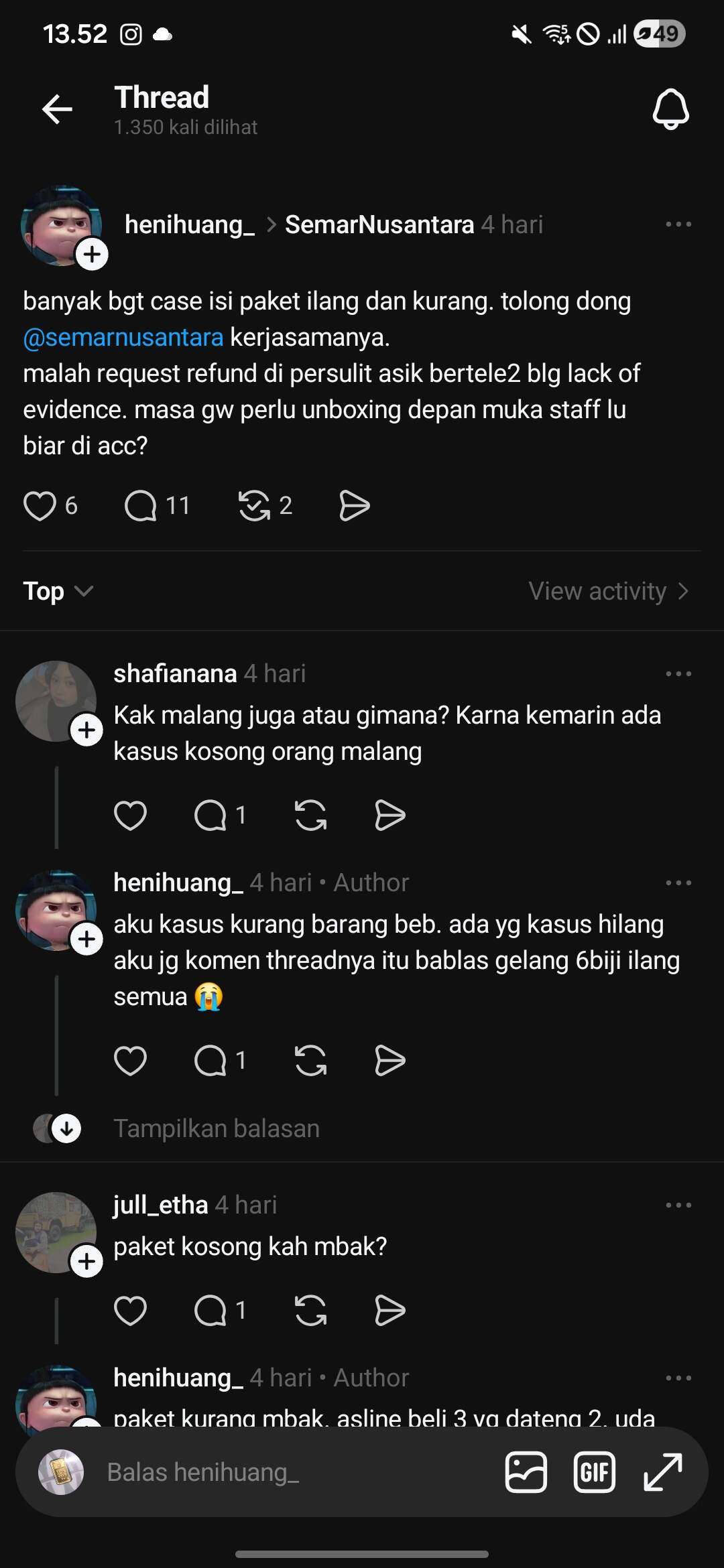 Namun pada kenyataannya, paket datang dalam kondisi kosong. Saya sebagai customer sangat menyayangkan karena dari pihak Semar Nusantara tidak ada antisipasi apa pun mengenai kejadian paket yang dibobol. Sejak artikel ini saya tulis, sudah banyak korban yang mengalami kejadian serupa.