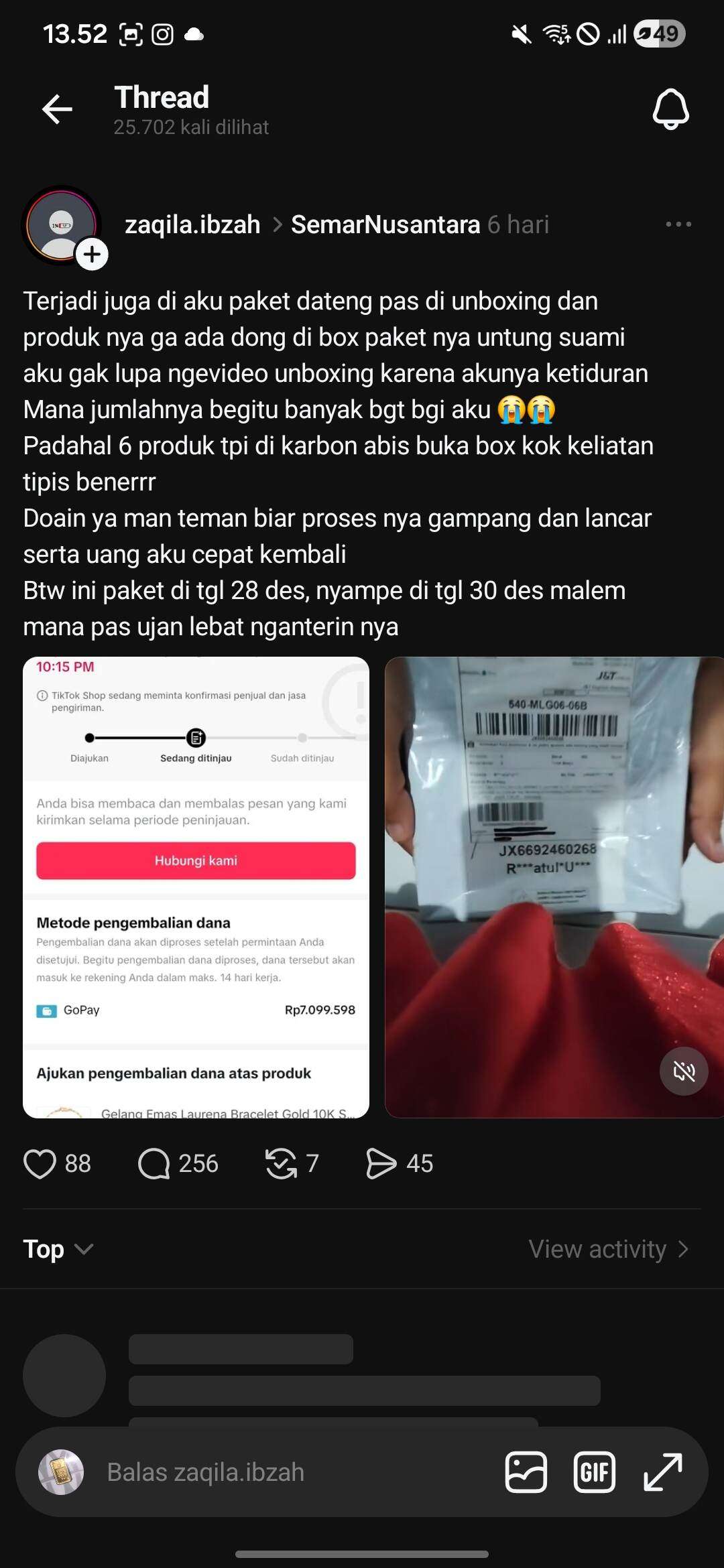 Hai, perkenalkan saya Rizqy, saya ingin mengeluhkan perihal paket saya berisi perhiasan emas dengan nomor resi JX6710456243 atas nama Rizqy Nur yang datang dalam kondisi kosong. Perhiasan emas yang saya pesan di TikTok dari Semar Nusantara tidak ada di dalam paket.