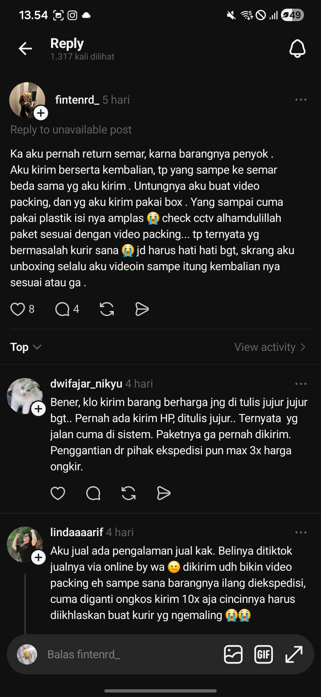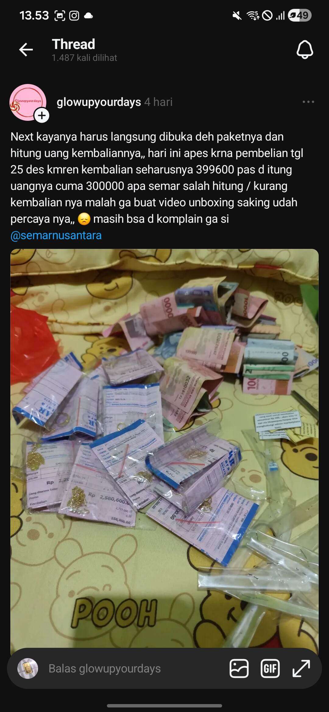 Tangkapan layar beberapa pengguna threads yang mengeluhkan hal yang sama (paket datang dalam kondisi kosong/kembalian uang hilang):