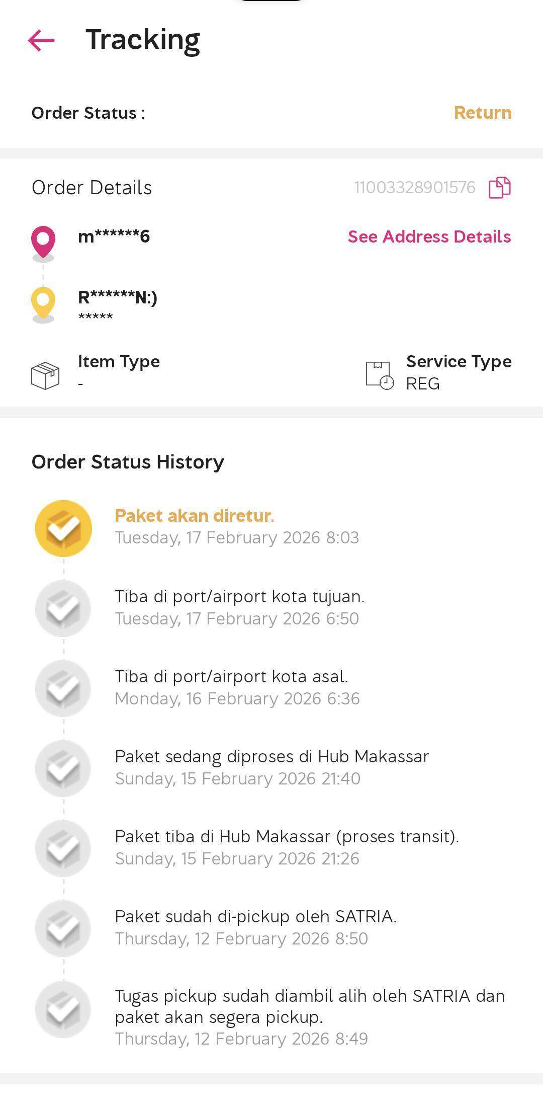 Pada hari Selasa, tanggal 17 Februari 2026 pukul 06.50, status tracking-nya menginformasikan: “Tiba di port/airport kota tujuan”, namun di hari yang sama pukul 08.03 status tracking-nya berubah menjadi: “Paket akan diretur”.