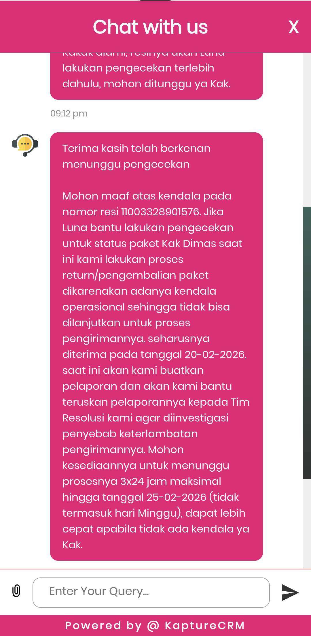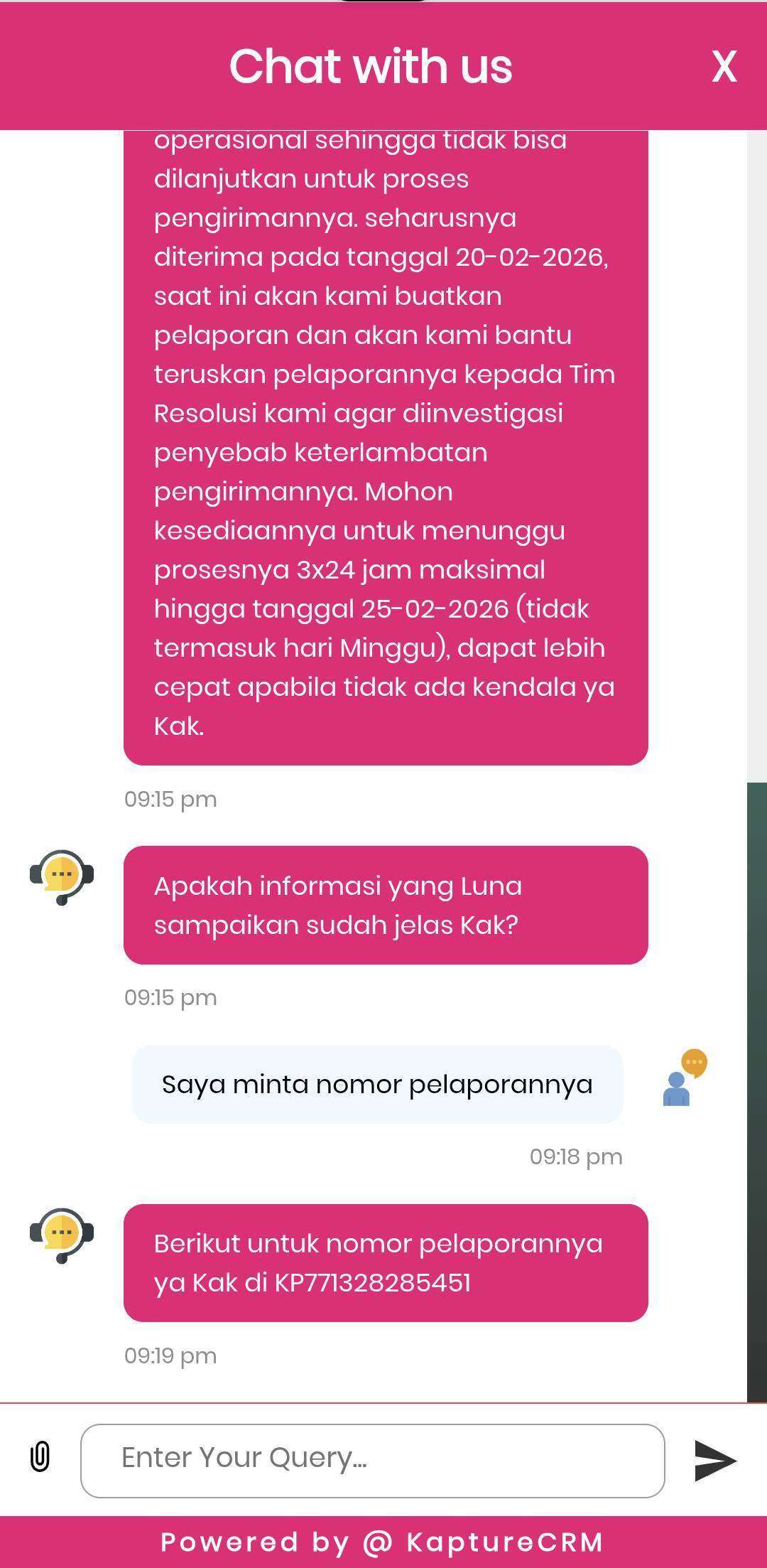 Saya mencoba menanyakan ke pihak Anteraja melalui chat di aplikasi Anteraja mengapa status tracking-nya tidak berubah dari tanggal 17 Februari 2026, dan diinformasikan bahwa seharusnya paket saya sudah akan diterima pada tanggal 20 Februari 2026, sehingga akan dibantu untuk investigasi penyebab keterlambatan dan dibuatkan pelaporannya dengan nomor tiket pelaporan: KP771328285451. Saya diminta menunggu maksimal sampai hari Rabu, tanggal 25 Februari 2026.