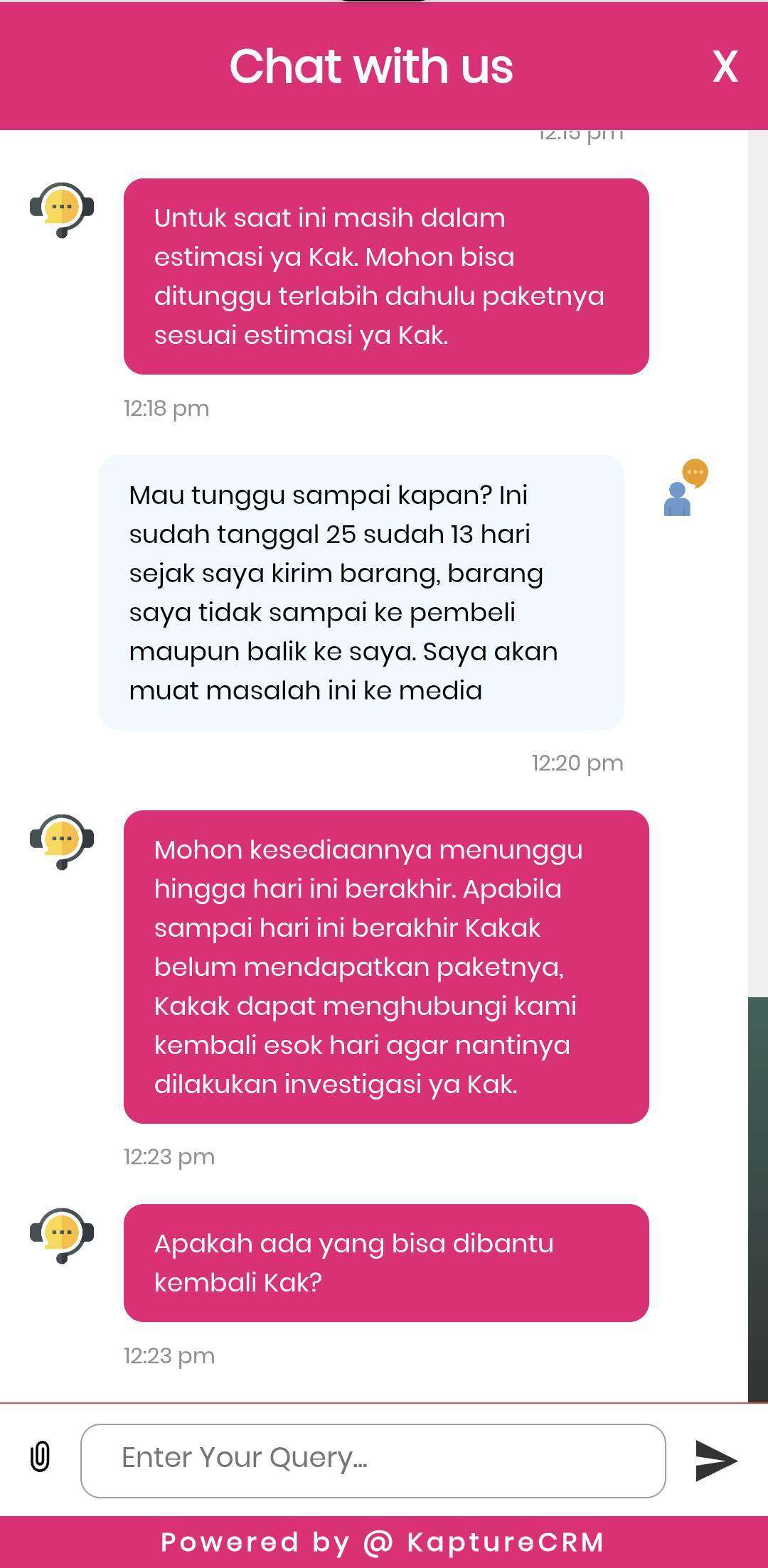 Saya merasa kendala ini tidak ditangani dengan serius oleh pihak Anteraja, karena saya hanya diminta menunggu dan menunggu tanpa ada kejelasan ataupun hasil investigasi paket saya.