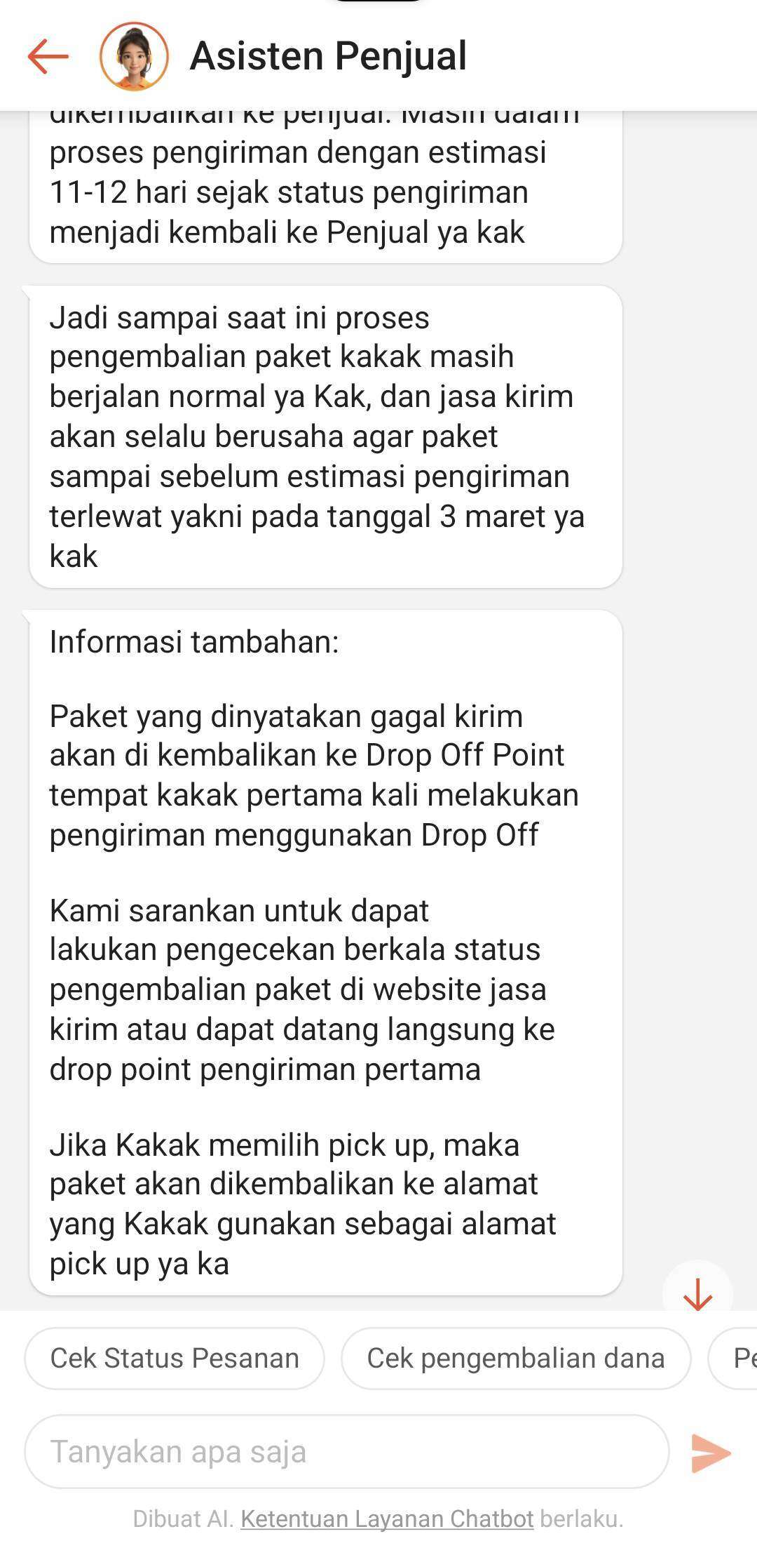 Sampai hari Rabu, tanggal 25 Februari 2026, paket saya tidak kunjung kembali dan status tracking-nya masih sama: “Paket akan diretur”. Pada hari Jumat, tanggal 27 Februari 2026, saya kembali menanyakan ke pihak Anteraja melalui chat di aplikasi Anteraja, diinformasikan bahwa paket saya sudah di gudang di Kota Makassar. Saya pun diminta untuk kembali menunggu maksimal sampai hari Selasa, tanggal 3 Maret 2026.