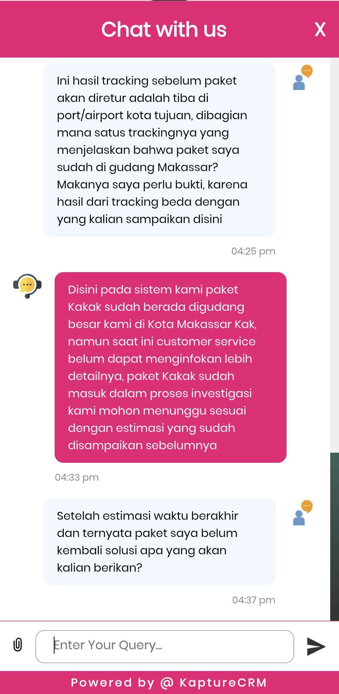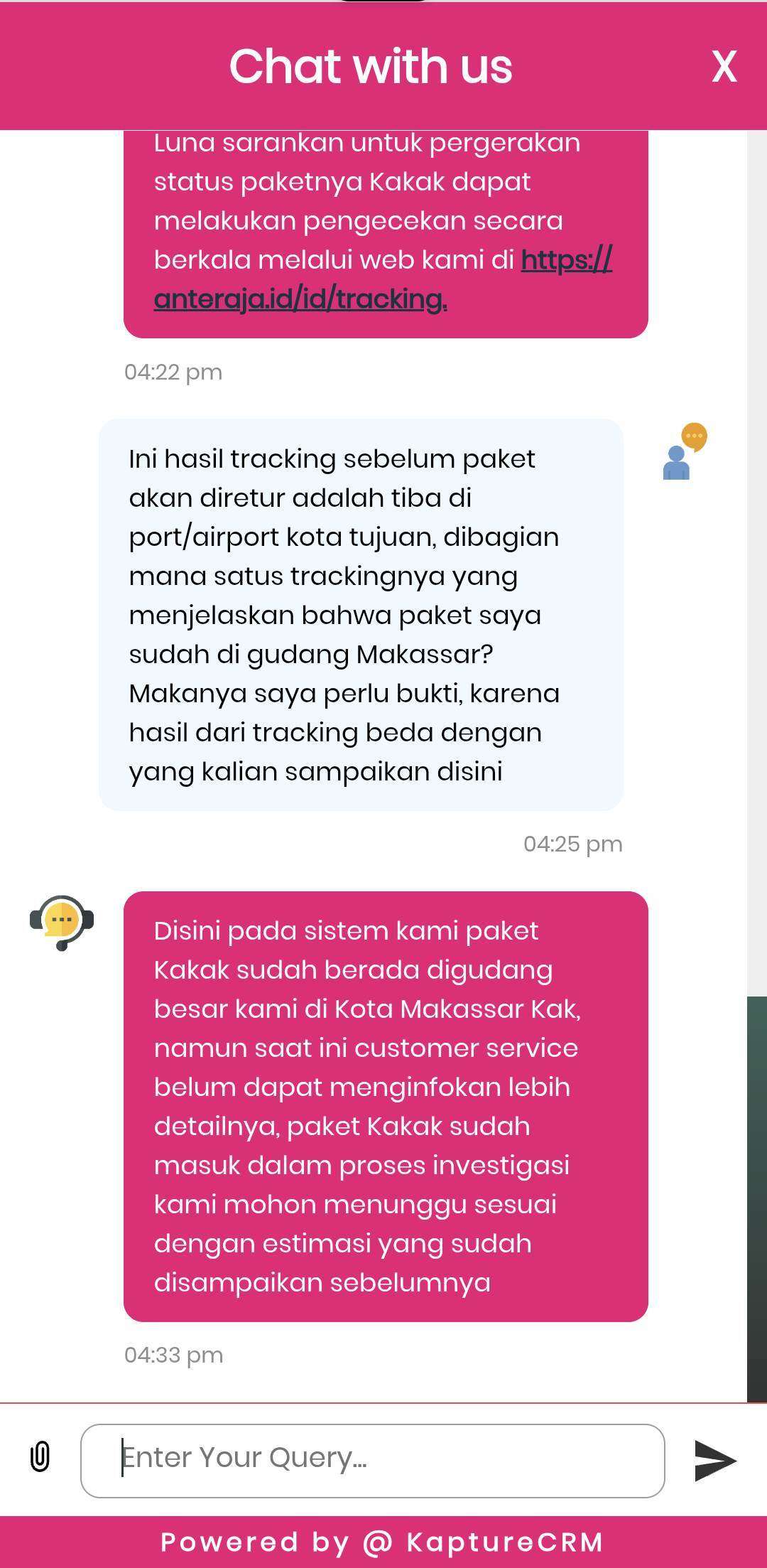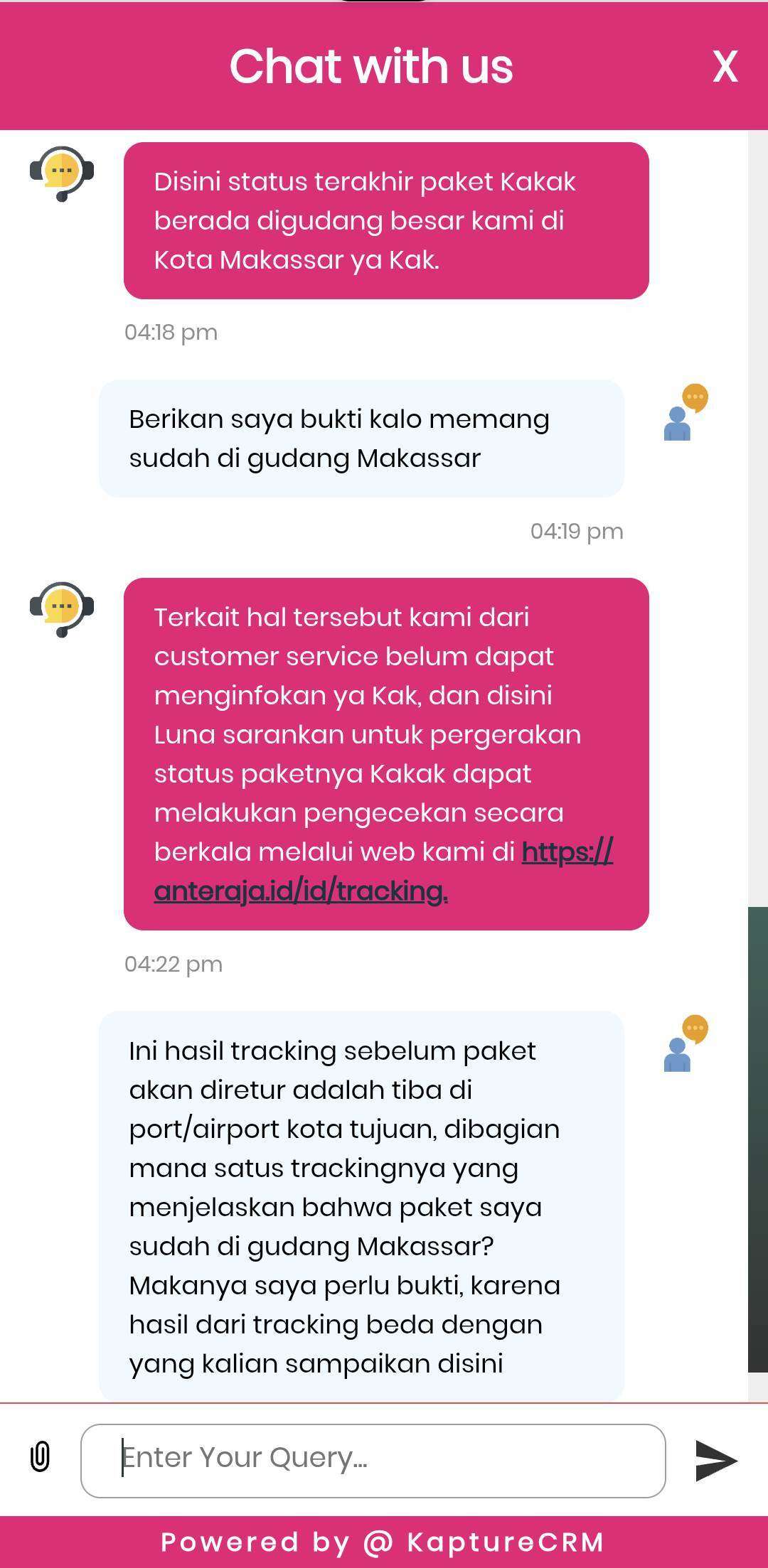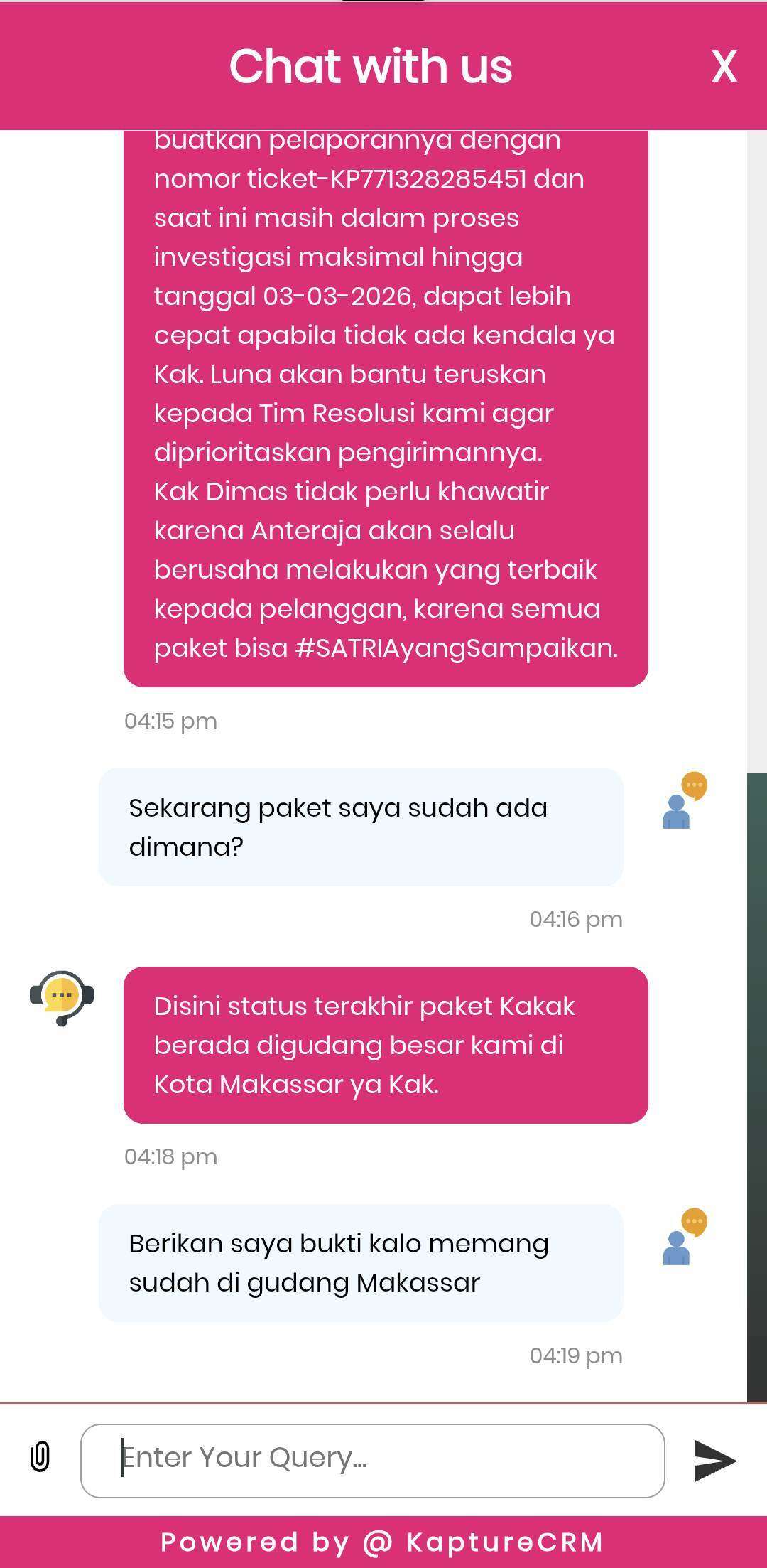 Saya meminta bukti jika memang paket saya sudah di gudang Kota Makassar dan CS Anteraja belum bisa memberikan bukti. Saya juga menanyakan apa solusi dari Anteraja apabila sampai batas waktu yang dijanjikan paket saya belum kembali, namun sampai chat ditutup otomatis oleh sistem aplikasi Anteraja, tidak ada jawaban yang diberikan CS Anteraja.