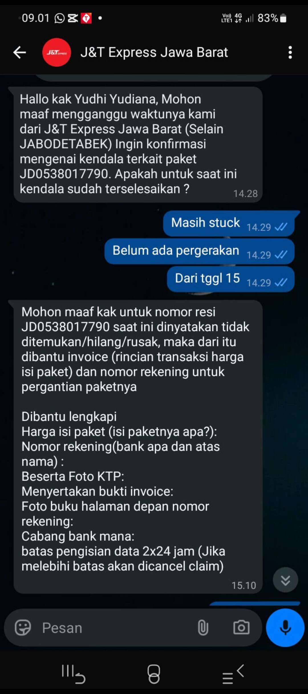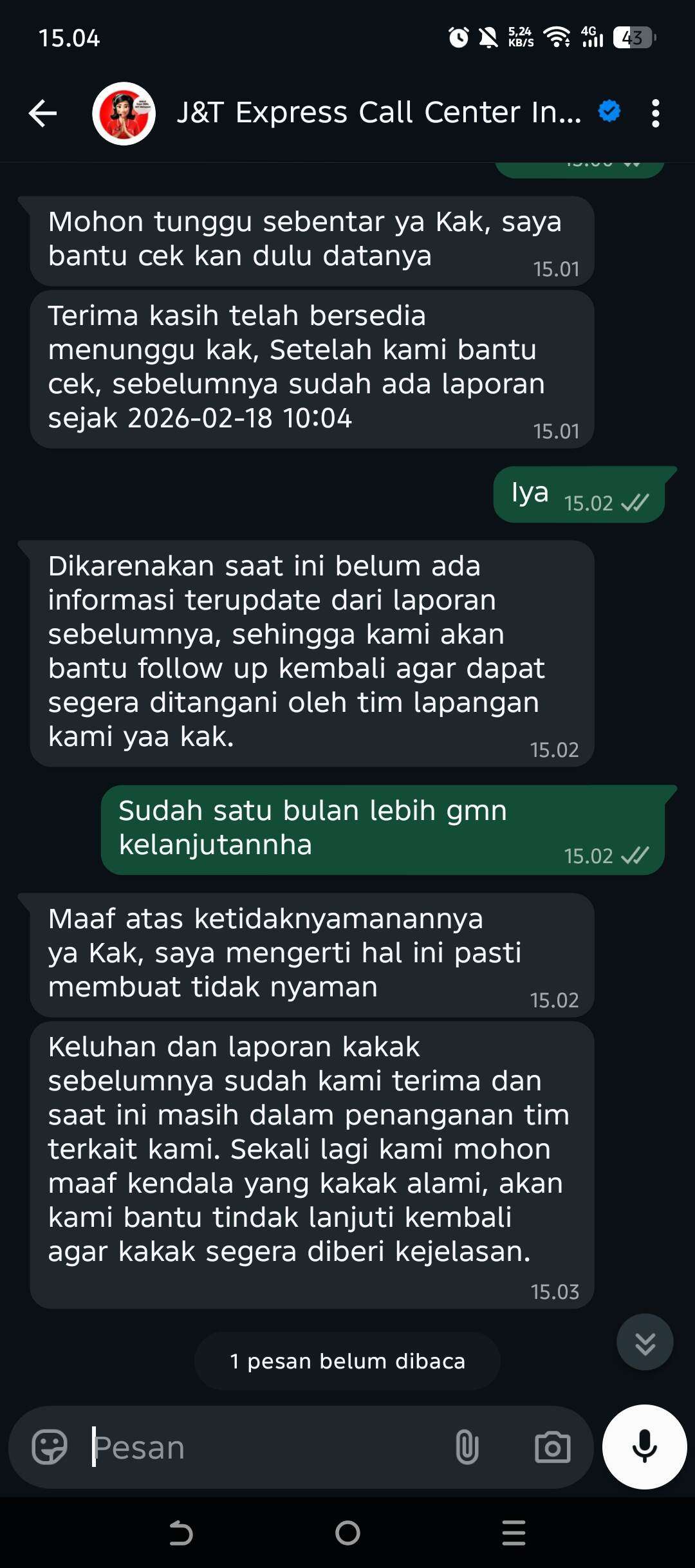 Saya sebagai penerima, barang dikirim dari Bandung menuju Boyolali pada tanggal 15 Februari 2026, tetapi stuck di Bandung dan saya follow up sampai Sabtu, 26 Maret tidak ada kejelasan (bukti terlampir). Cuma disuruh menunggu dan menunggu, dan saya tanya kapan ada kejelasan, tidak ada kejelasan, hanya disuruh menunggu.