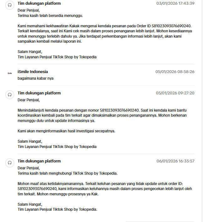 Paket tersebut terjebak di Seller Center tanpa kejelasan hingga saat ini. Kami sebagai seller sangat dirugikan karena dana kami menjadi terhambat dan tidak bisa ditarik. Pihak Tokopedia TikTok Shop melalui tiket hanya mengatakan akan membantu koordinasi, tapi hingga kini masih belum ada kejelasan sama sekali.
