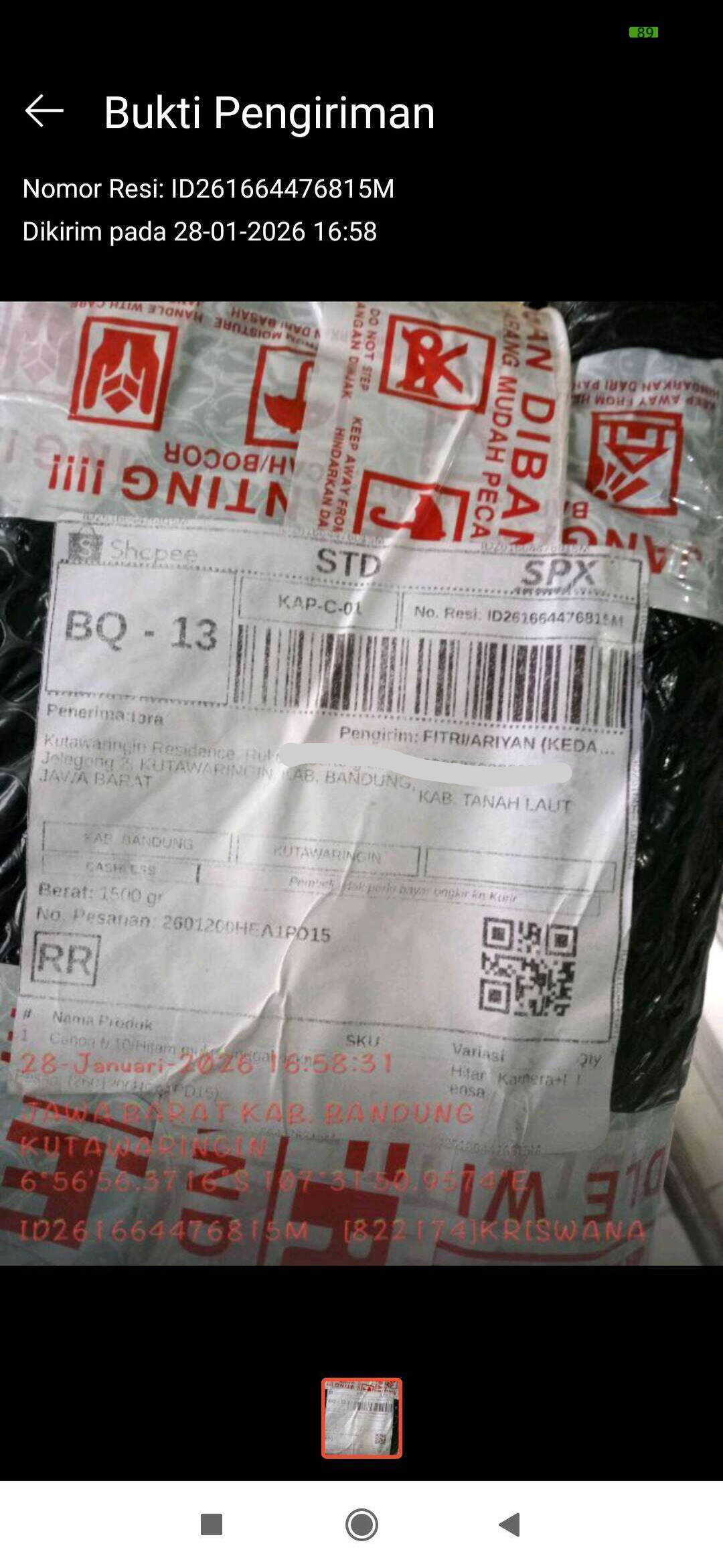 Pembeli mengirimkan paket pengembalian lewat jasa kurir yang ditunjuk oleh Shopee, yaitu Shopee Express, pada tanggal 22 Januari 2026 dengan nomor resi ID261664476815M dan sampai ke alamat kami pada tanggal 28 Januari 2026 pukul 16.58. Berikut terlampir foto bukti penerimaan paket yang dilampirkan kurir Shopee Express Katapang atas nama Kri***: