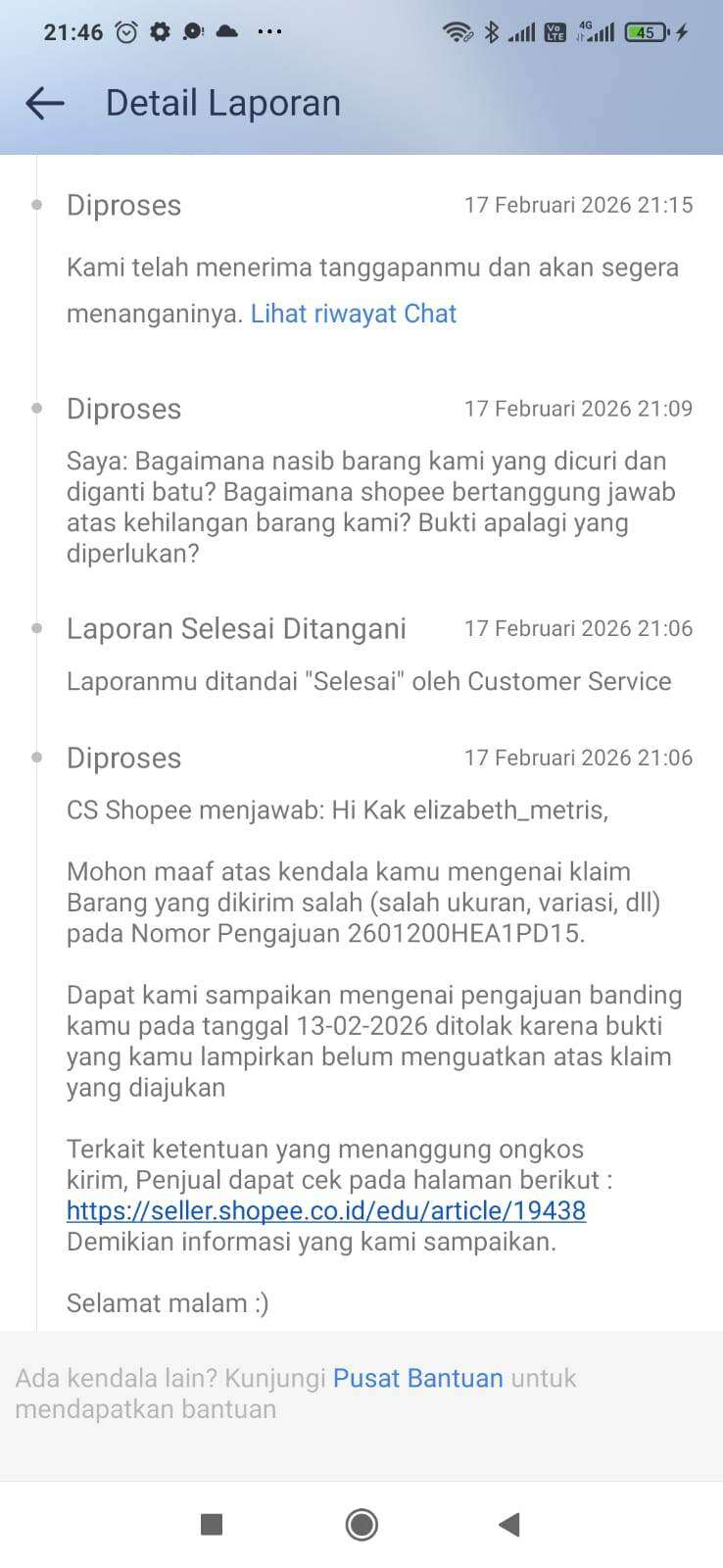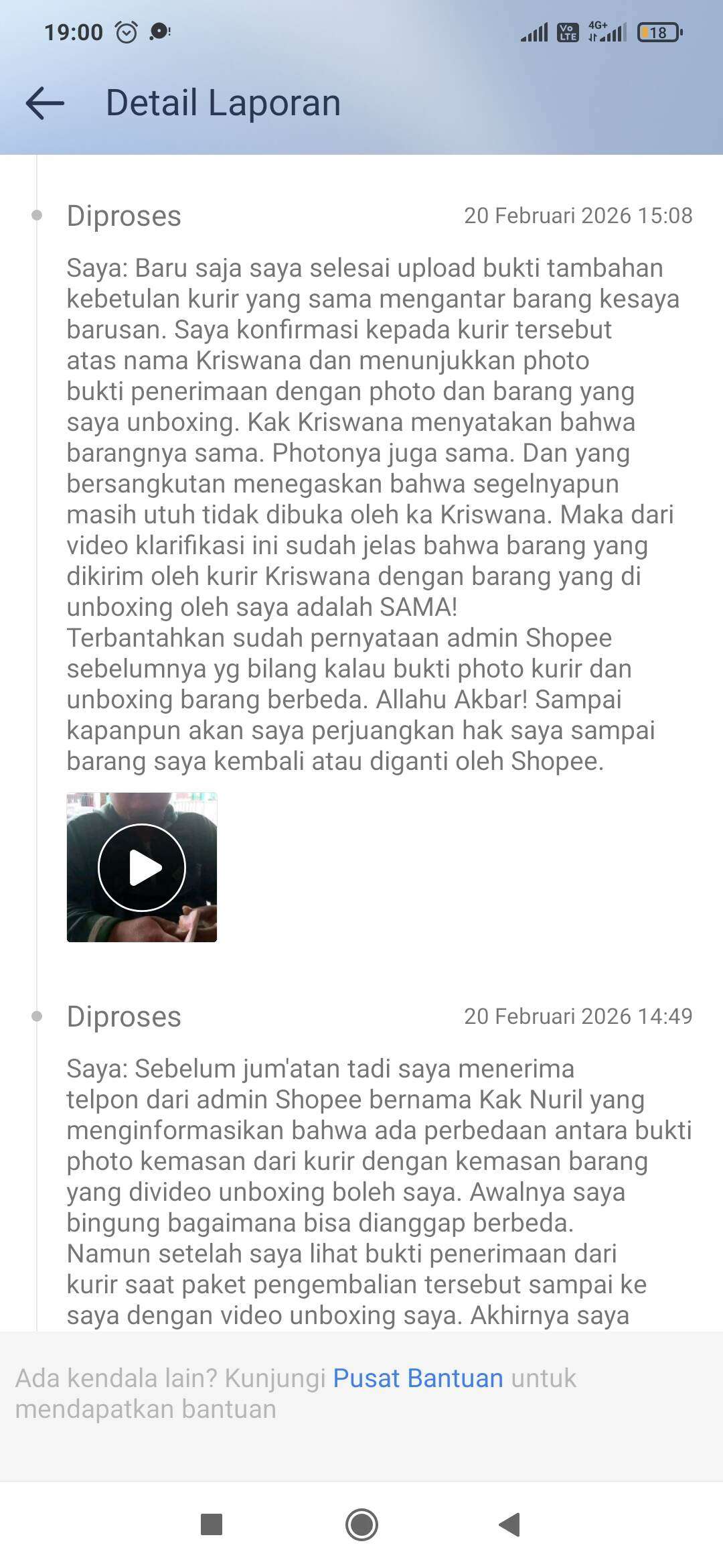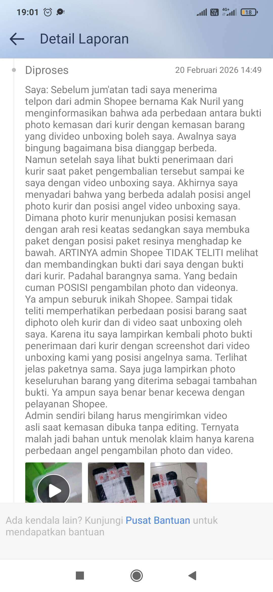Saya kemudian menghubungi kembali admin Shopee dan menanyakan perihal tersebut. Admin Shopee berjanji akan menghubungi kembali dan akhirnya pada Jumat, 20 Februari 2026 pukul 11.29 siang admin Shopee atas nama Nur*** menelepon dan memberikan informasi bahwa alasan klaim saya ditolak karena ada perbedaan bukti foto yang dilampirkan kurir saat mengantarkan barang pengembalian ke kami dengan video barang unboxing yang kami lampirkan.