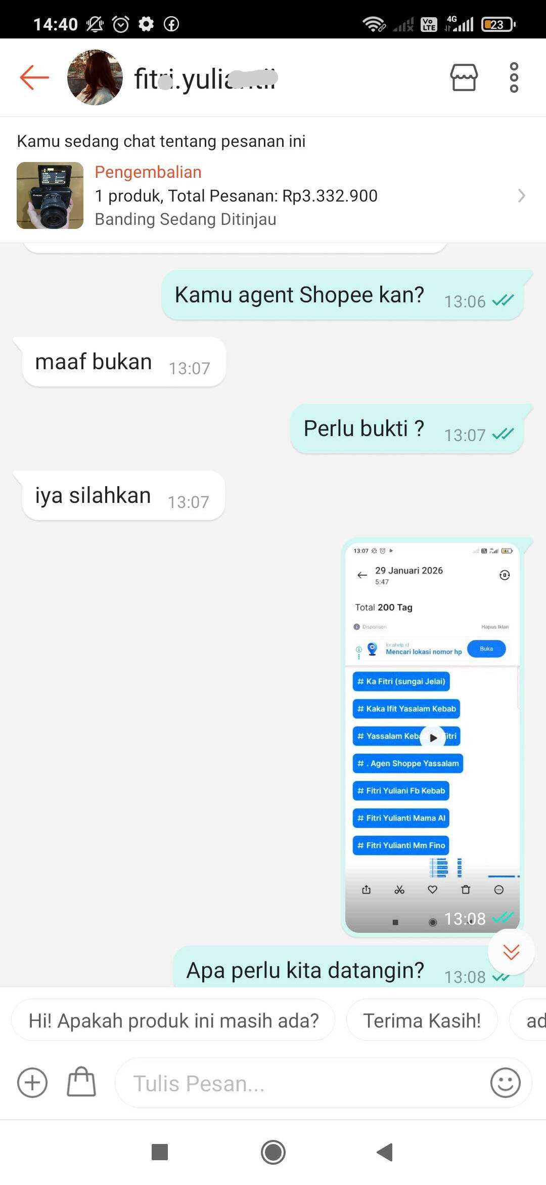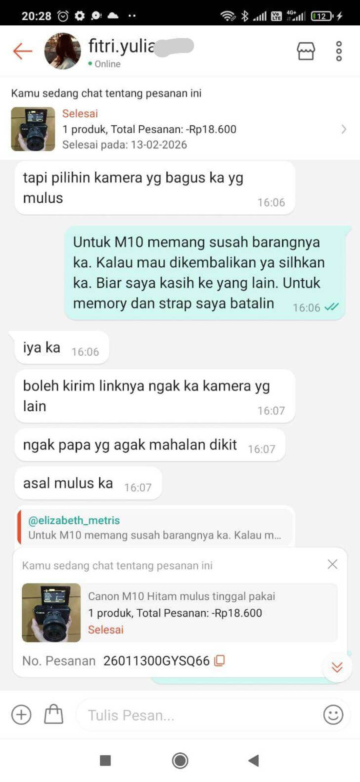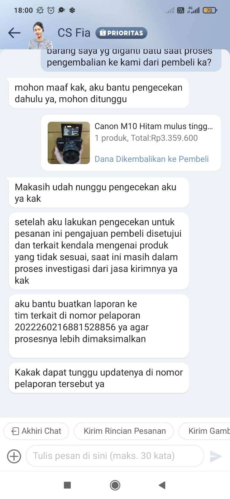 Tiba-tiba pada tanggal 13 Februari saya mendapatkan notifikasi bahwa dana dikembalikan ke pembeli, sedangkan hak saya sebagai penjual belum menerima barang yang sesuai berupa kamera. Laporan berkaitan kebohongan pembeli pun tidak ditanggapi. Customer service hanya bilang kalau klaimnya masih dalam tahap investigasi kurir.