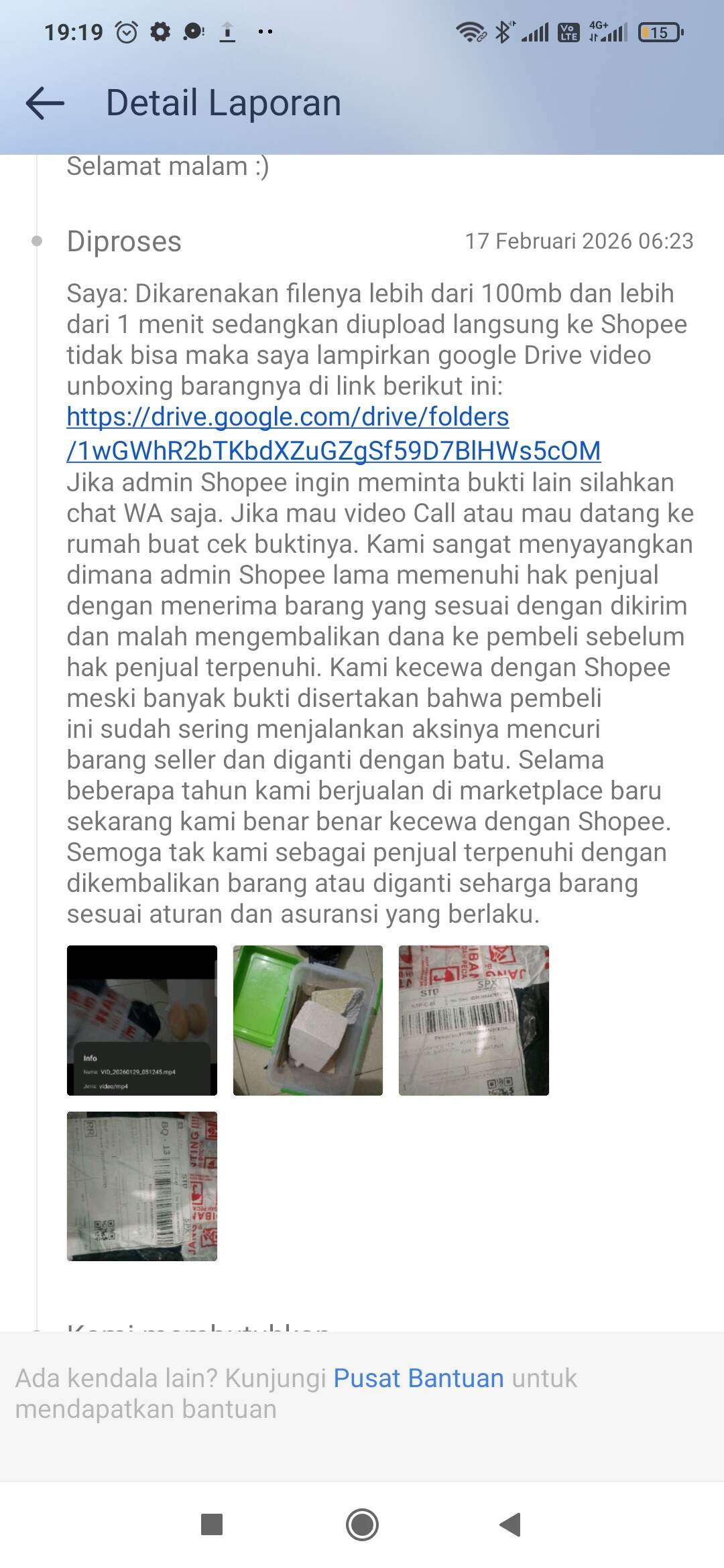 Saya jelaskan bahwa karena videonya lebih dari 1 menit dan filenya besar, jadi saya upload ke Google Drive dan link-nya saya sertakan di chat diskusi dengan admin Shopee tersebut.