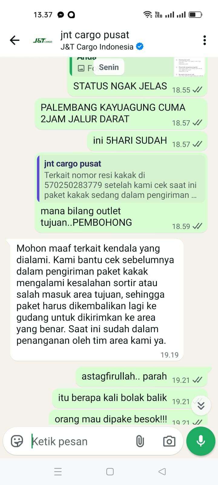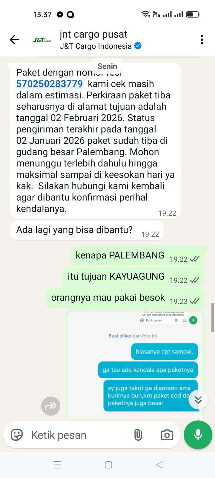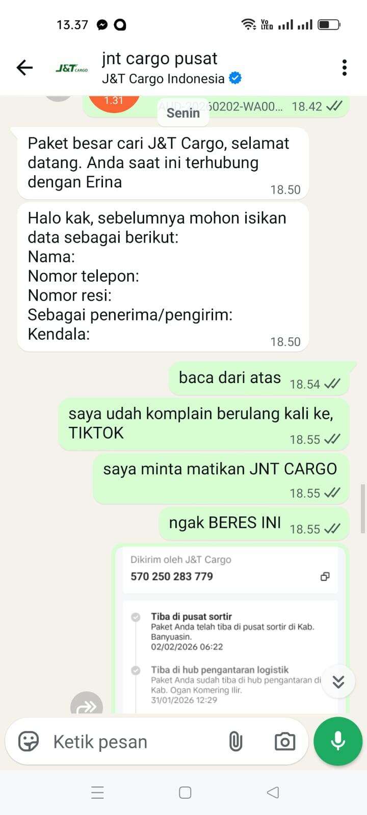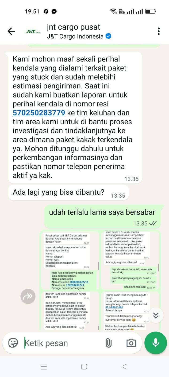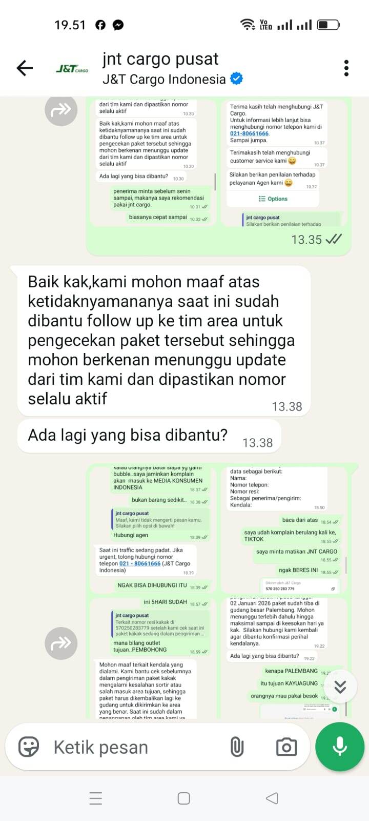 Sampai tanggal 5 Februari 2026, tidak ada pembaruan di websitenya. Saya menelepon nomor yang tertera di sana yang menyatakan sedang mengantarkan paket. Dia menjawab bahwa itu salah rute dan jauh, jika ingin mengambil paketnya sendiri. Saya menjelaskan bahwa saya adalah penjual, dan jika demikian, saya akan melaporkan masalah ini ke J&T Cargo pusat (chat ke J&T Cargo pusat terlampir), tetapi hasilnya masih nihil… Masih menunggu tanpa kejelasan.