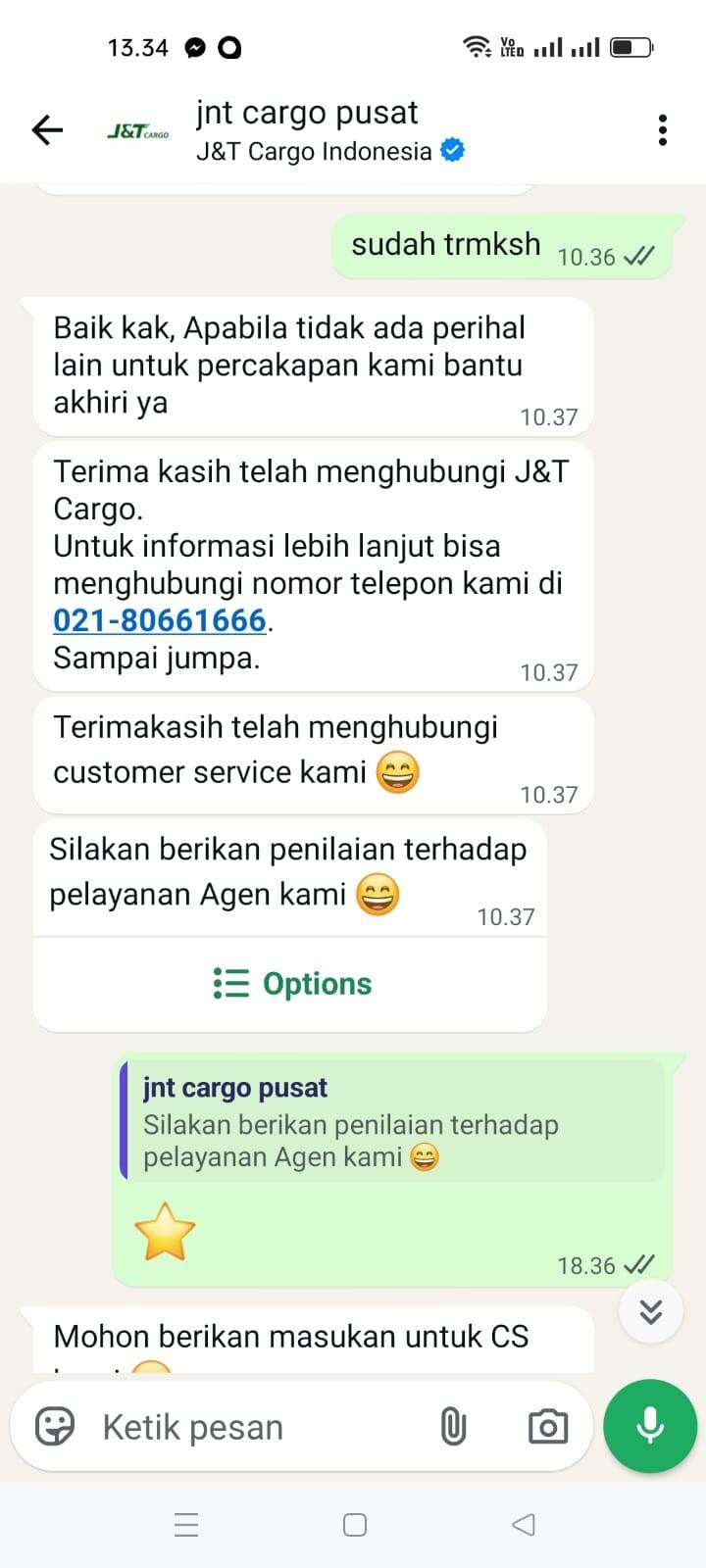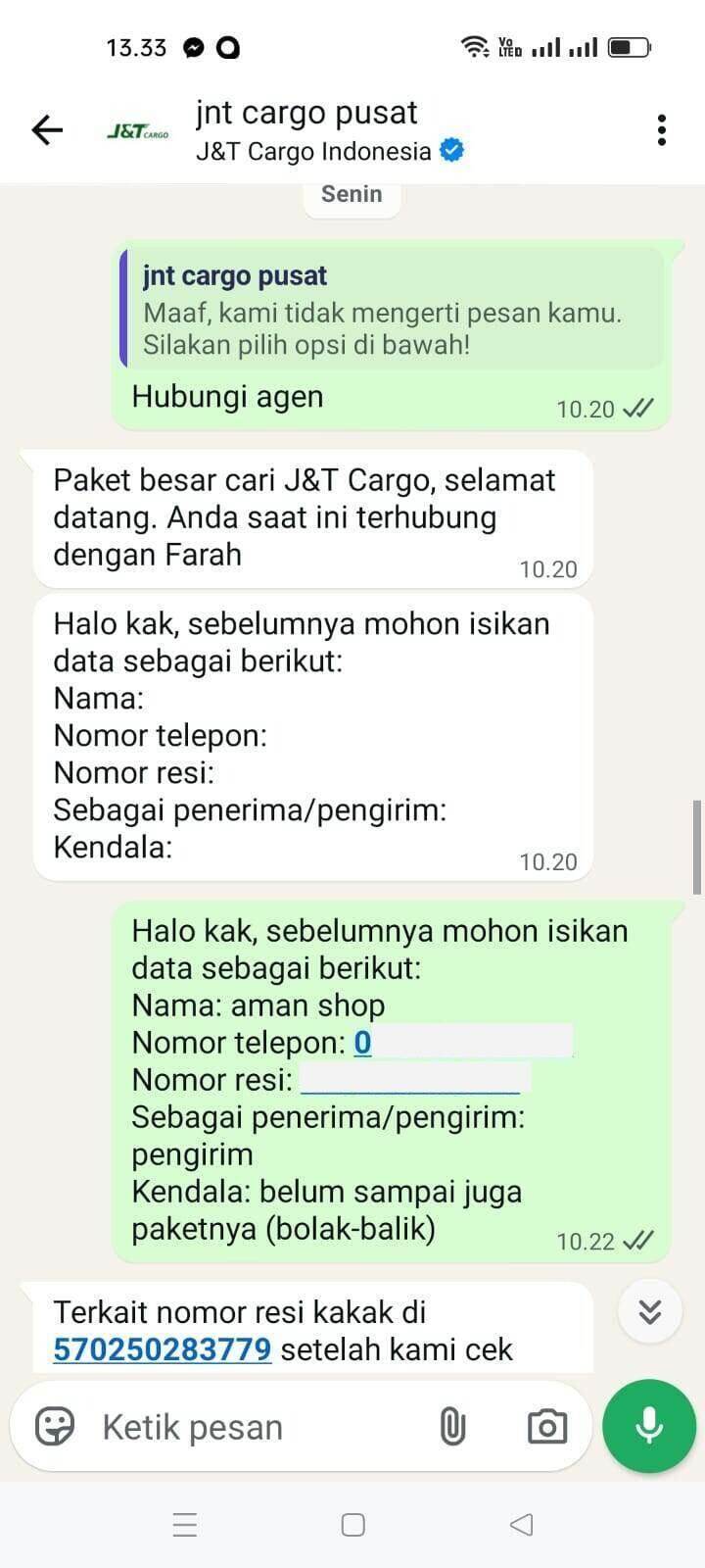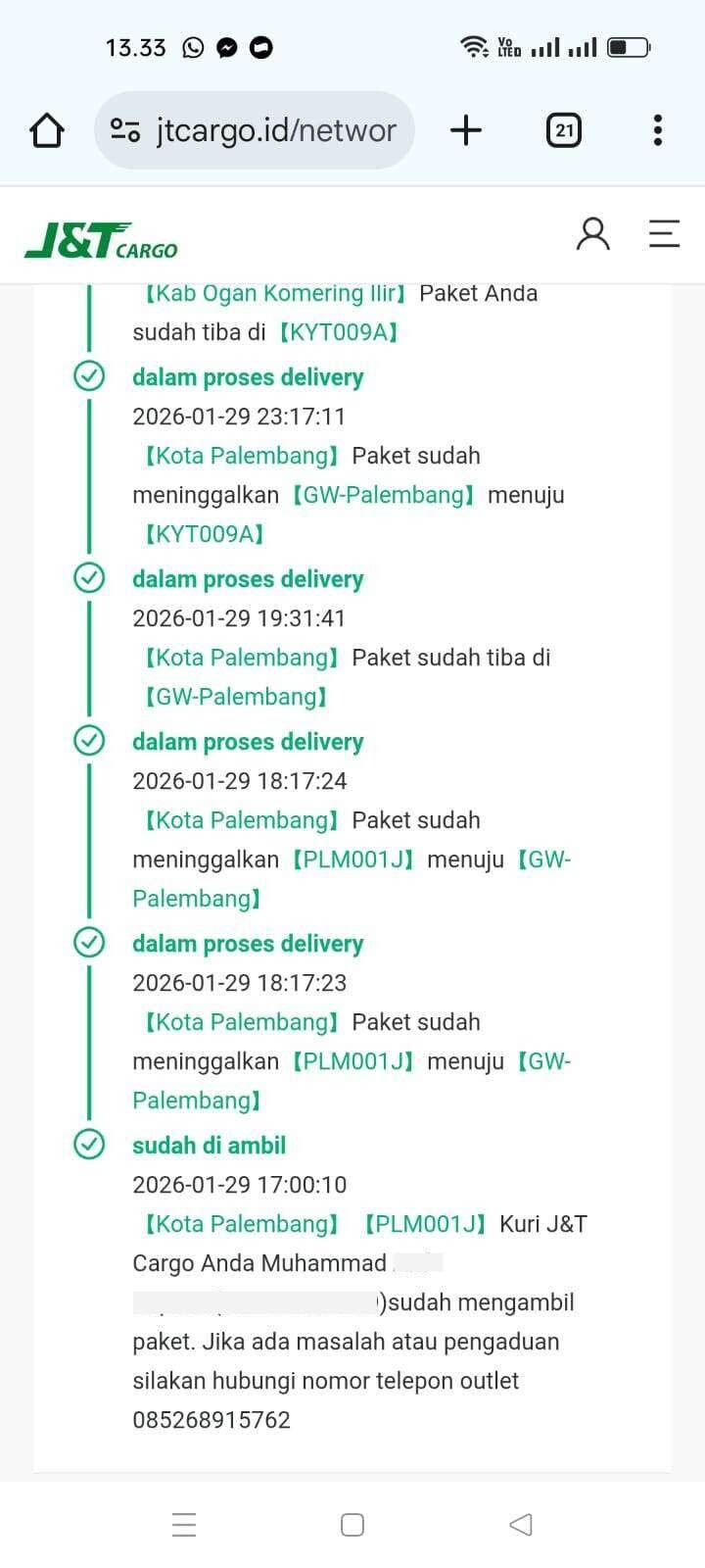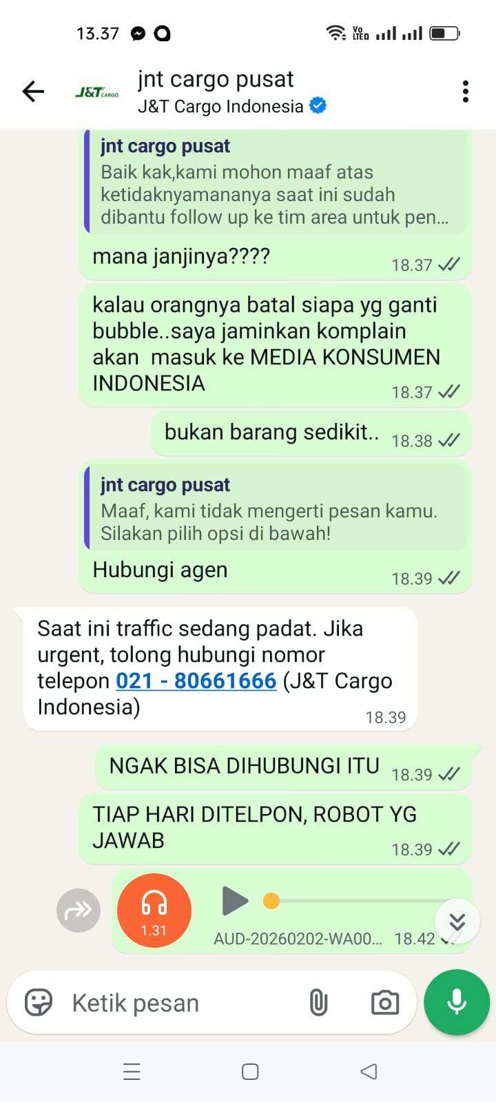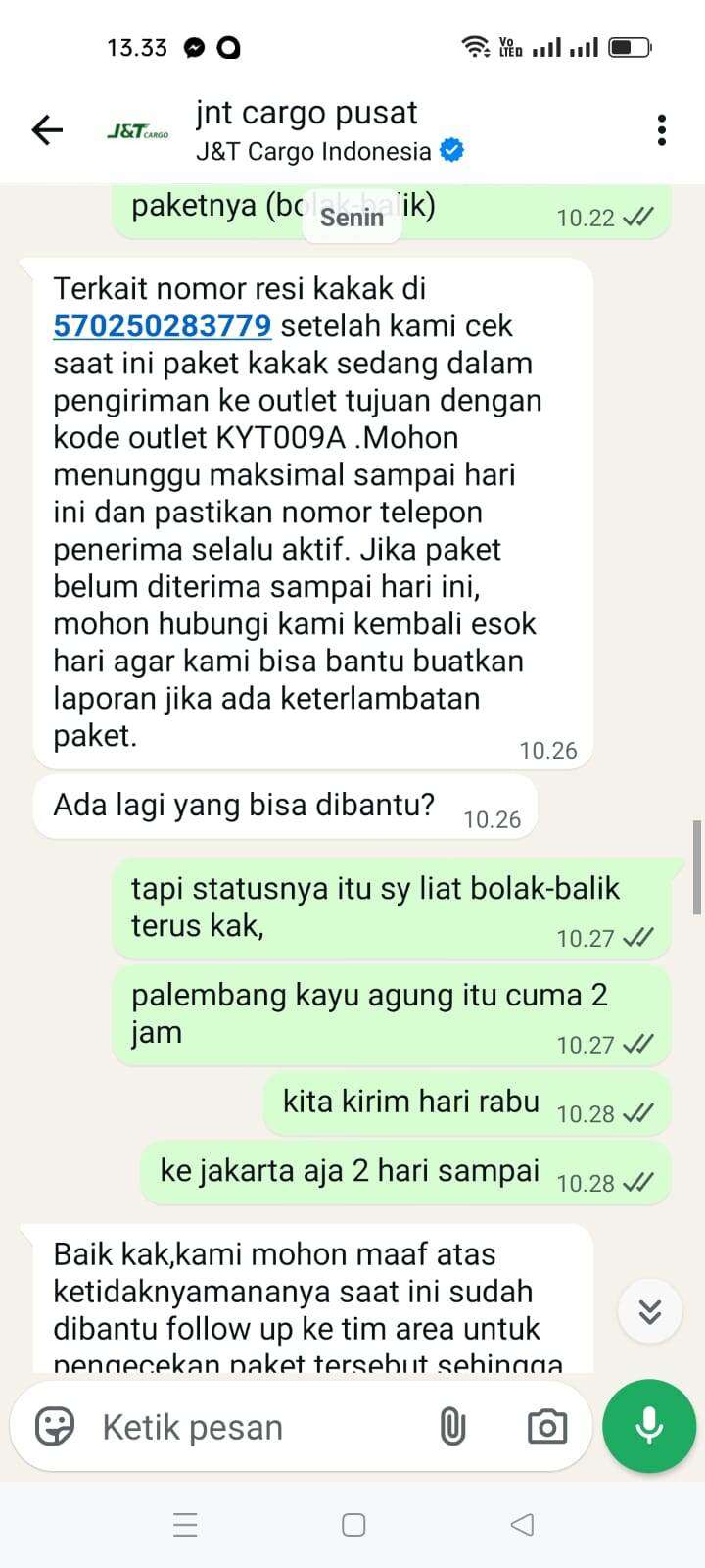 Sampai tanggal 5 Februari 2026, tidak ada pembaruan di websitenya. Saya menelepon nomor yang tertera di sana yang menyatakan sedang mengantarkan paket. Dia menjawab bahwa itu salah rute dan jauh, jika ingin mengambil paketnya sendiri. Saya menjelaskan bahwa saya adalah penjual, dan jika demikian, saya akan melaporkan masalah ini ke J&T Cargo pusat (chat ke J&T Cargo pusat terlampir), tetapi hasilnya masih nihil… Masih menunggu tanpa kejelasan.