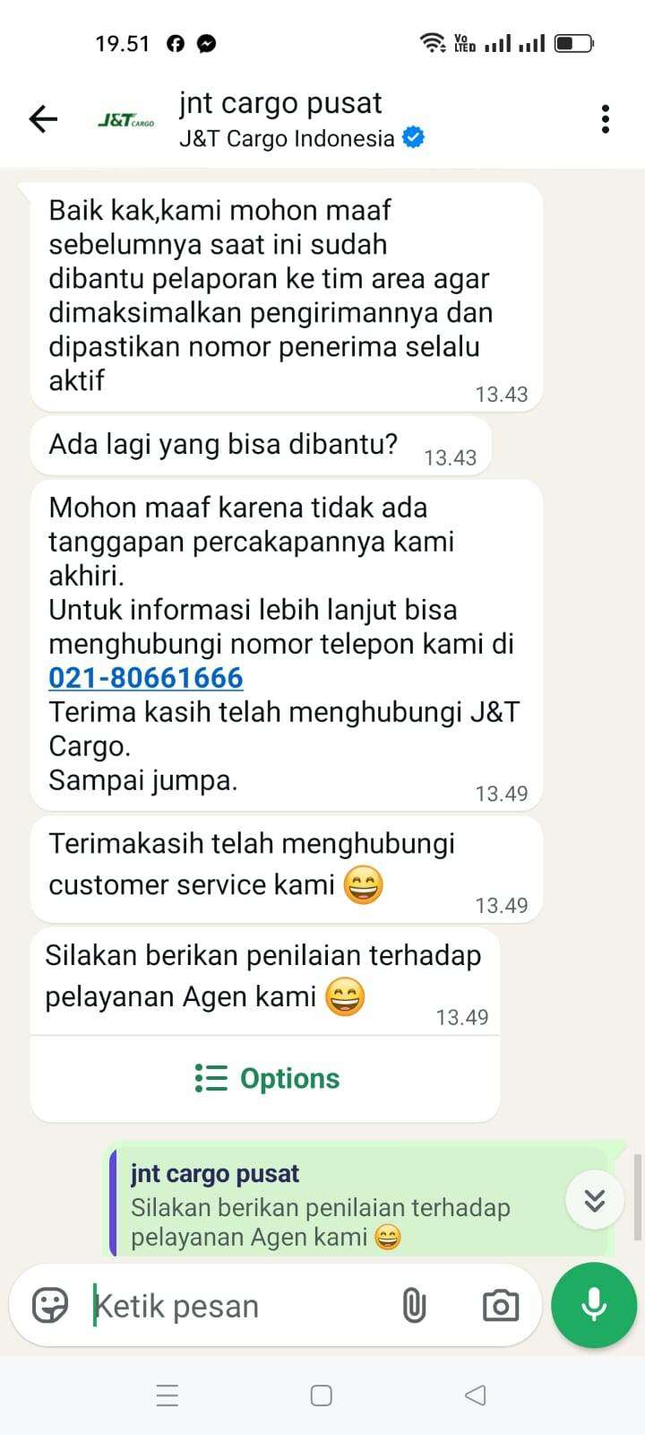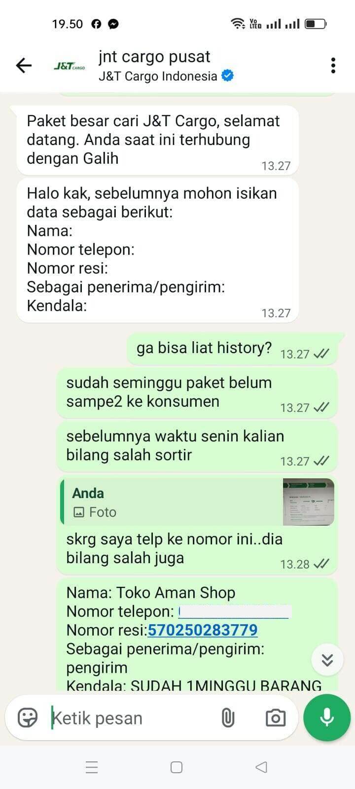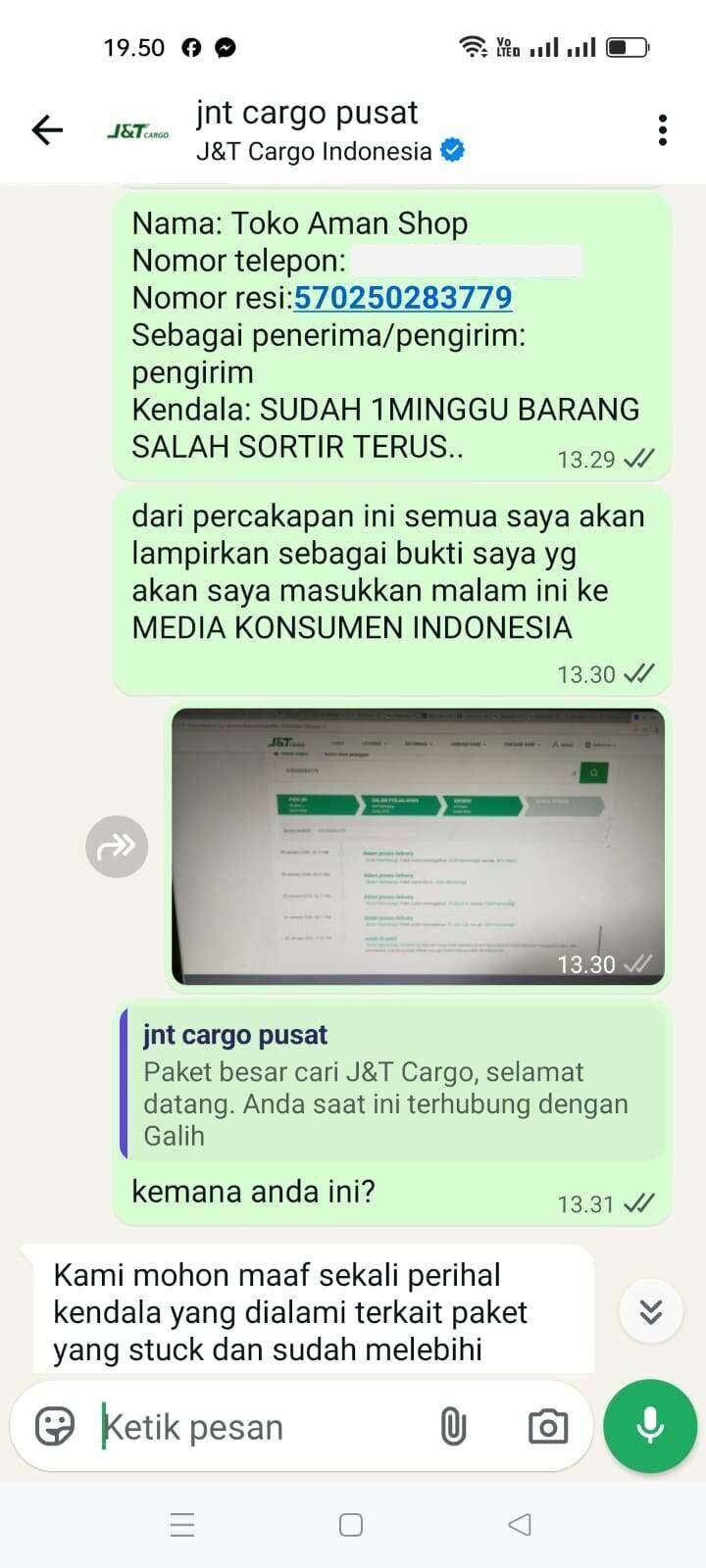 Pada pukul 18:54 saya menghubungi kembali melalui WA J&T Cargo (gambar 5&6). Pukul 19:19 J&T Cargo menjawab bahwa ada salah sortir (gambar 7).