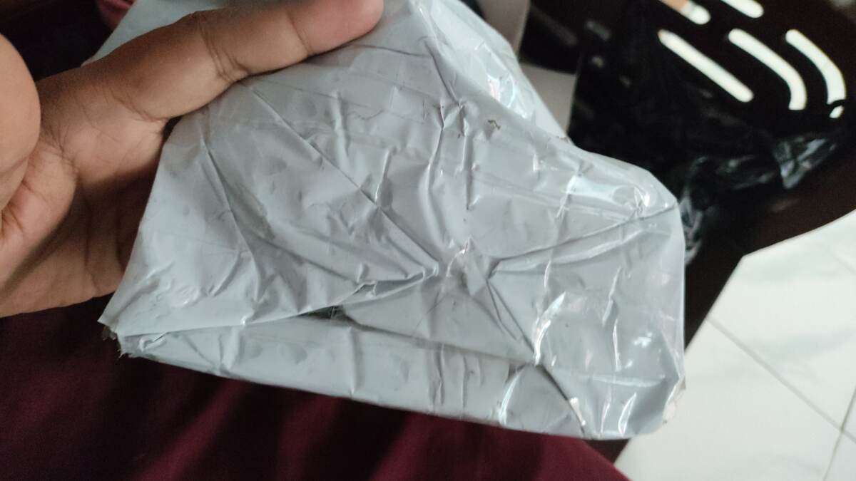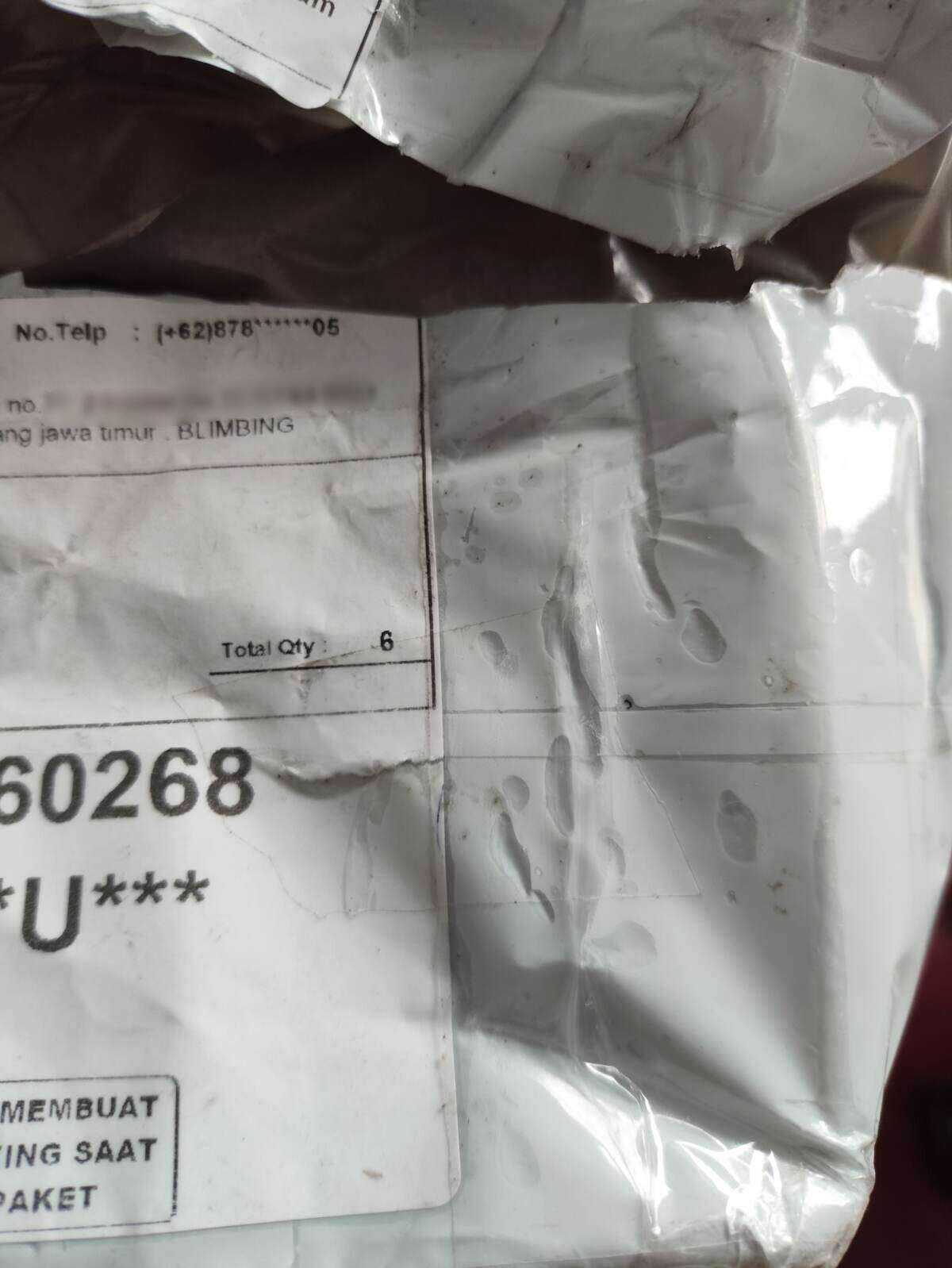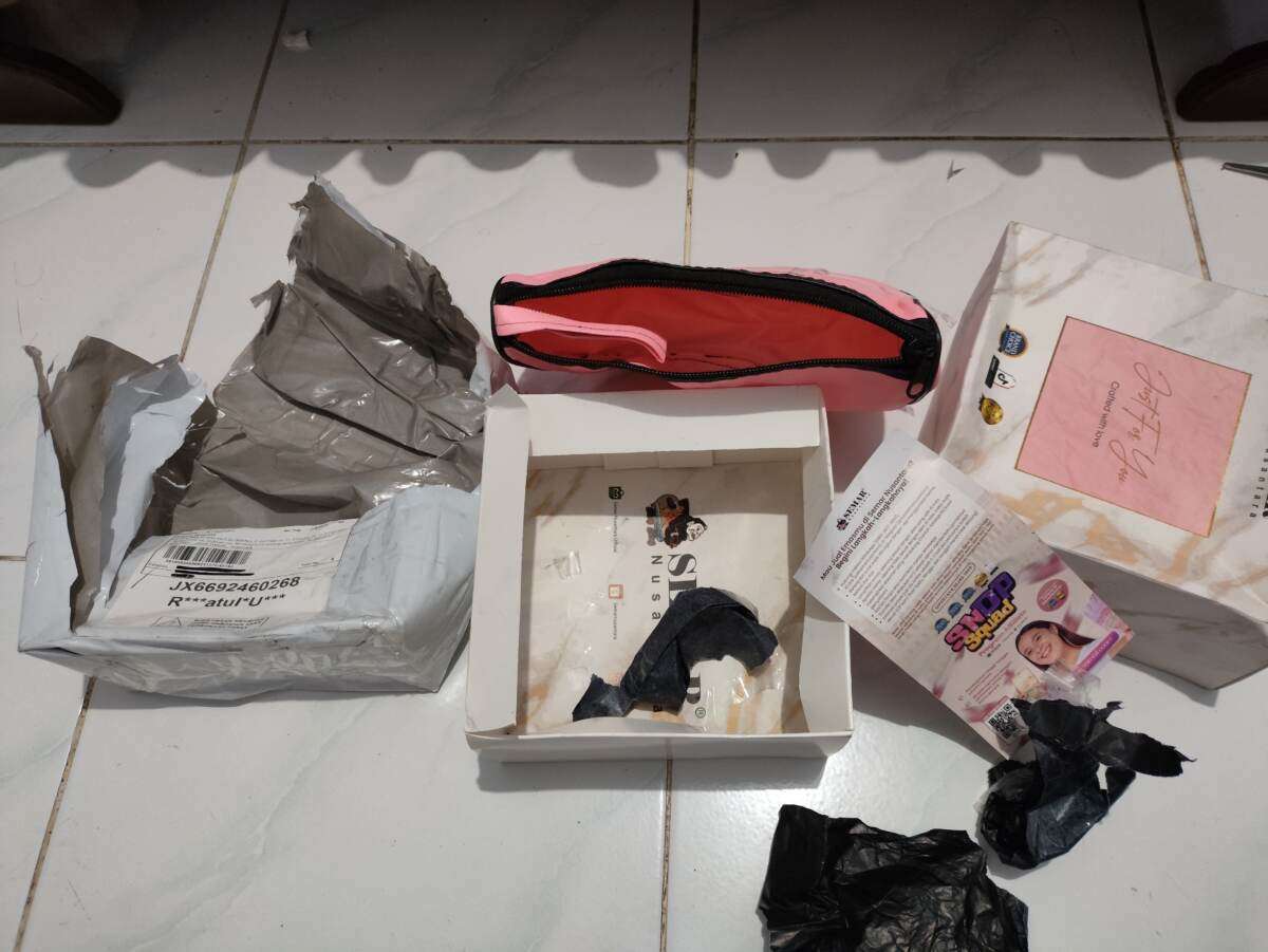 Saat saya meneliti bungkus box paket, terdapat beberapa titik pada bungkusnya yang menandakan box paket sebelumnya sudah dibuka dan di-repack ulang, seperti bekas gunting di bagian dalam plastik paket lalu ditimpa dengan isolasi bening, bekas sobekan yang juga ditimpa dengan isolasi bening, serta sobekan di bagian resi yang kembali ditimpa dengan isolasi bening.