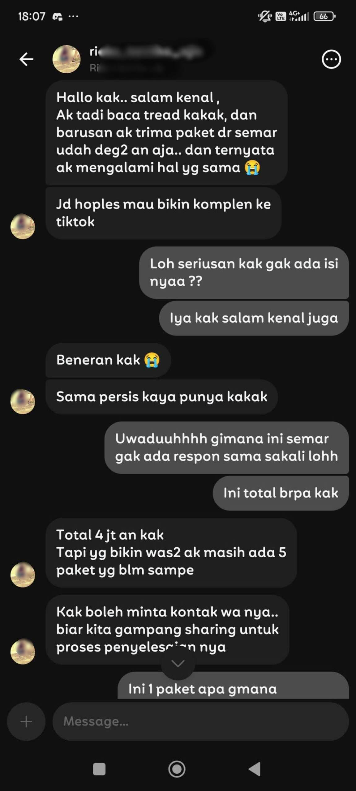 Ini bukan nominal kecil, tetapi nominal besar sekitar Rp7.000.000. Banyak juga kendala serupa yang dialami oleh orang lain, terutama teman saya asal Salatiga, bahkan yang terdekat dengan Klaten, yang juga mengalami paket dengan isi kosong dari Toko Semar Nusantara melalui aplikasi TikTok dan dikirim oleh jasa ekspedisi J&T.