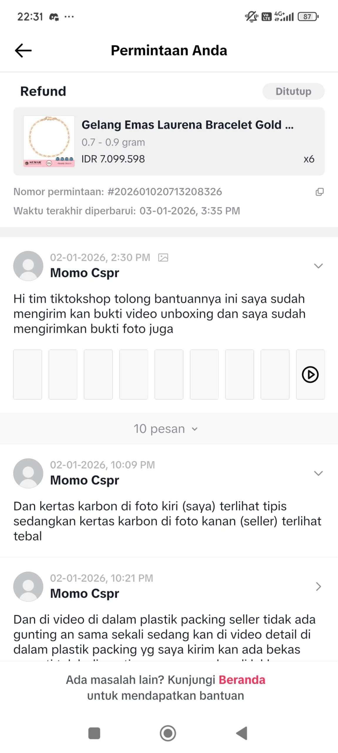 Saya sudah mengajukan pengembalian dana, tetapi ditolak oleh seller Semar Nusantara dengan alasan kurang bukti. Padahal, saya sudah melampirkan video detail unboxing paket tanpa dipotong dan tanpa dipercepat, serta foto-foto lainnya. Pihak seller Semar Nusantara juga mengirimkan video packing dan foto-foto tambahan jika memang produk dimasukkan ke dalam box paket.