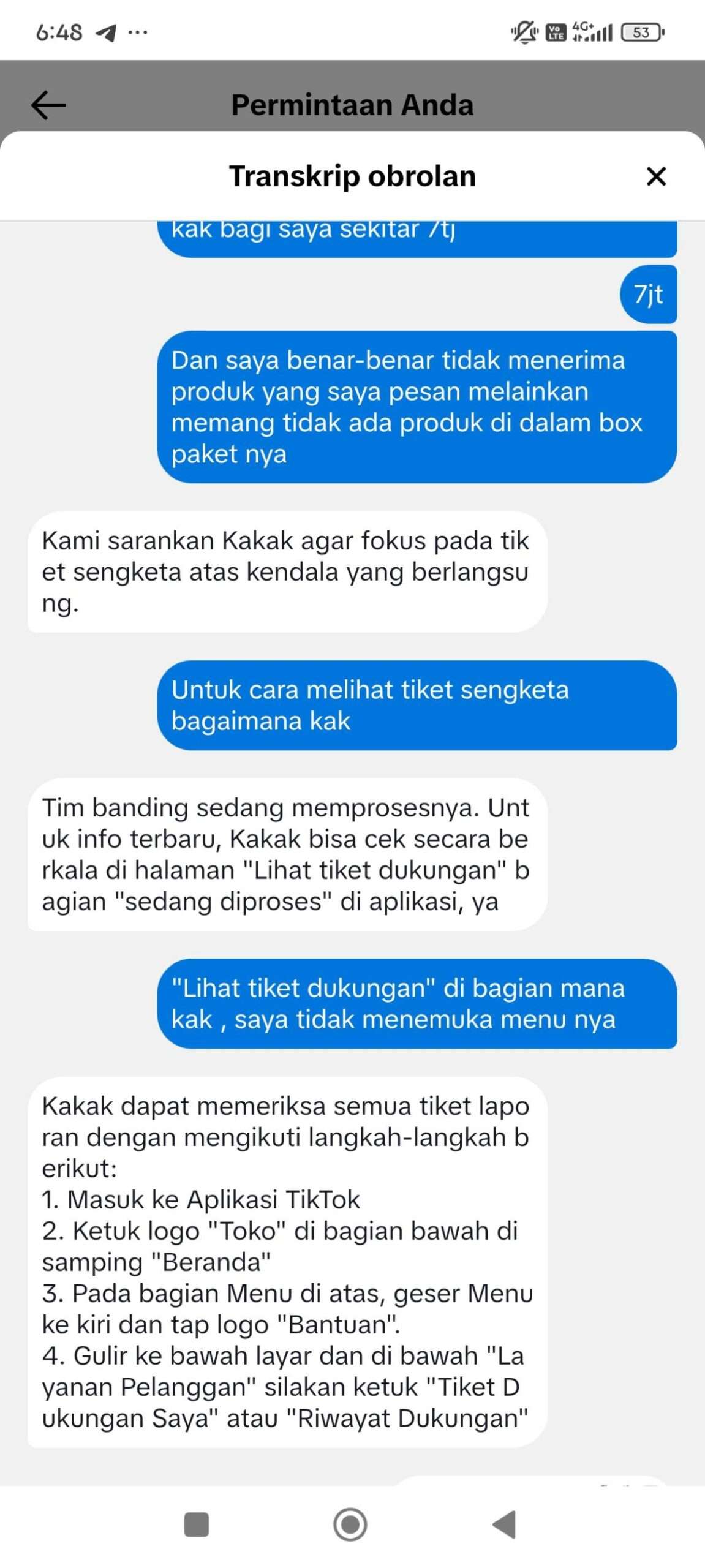 Hai, di sini saya mengeluhkan karena paket saya, dengan nomor resi J&T Expres: JX6692460268 atas nama Rohmatul Ulum, yang order di toko Semar Nusantara melalui aplikasi TikTok, sampai ke tangan saya. Akan tetapi, produk yang saya pesan tidak ada di dalam box paket.