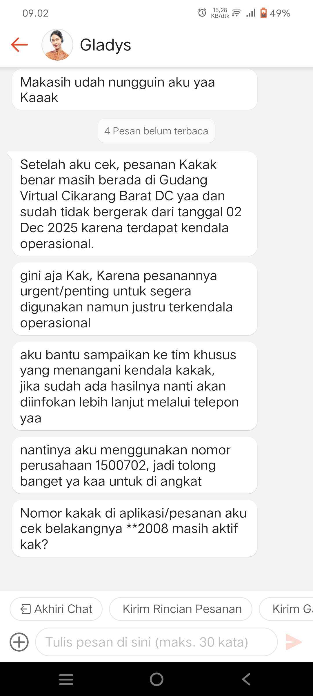 - Karena masih di gudang, kami sudah melaporkan paket Anda bla bla bla.