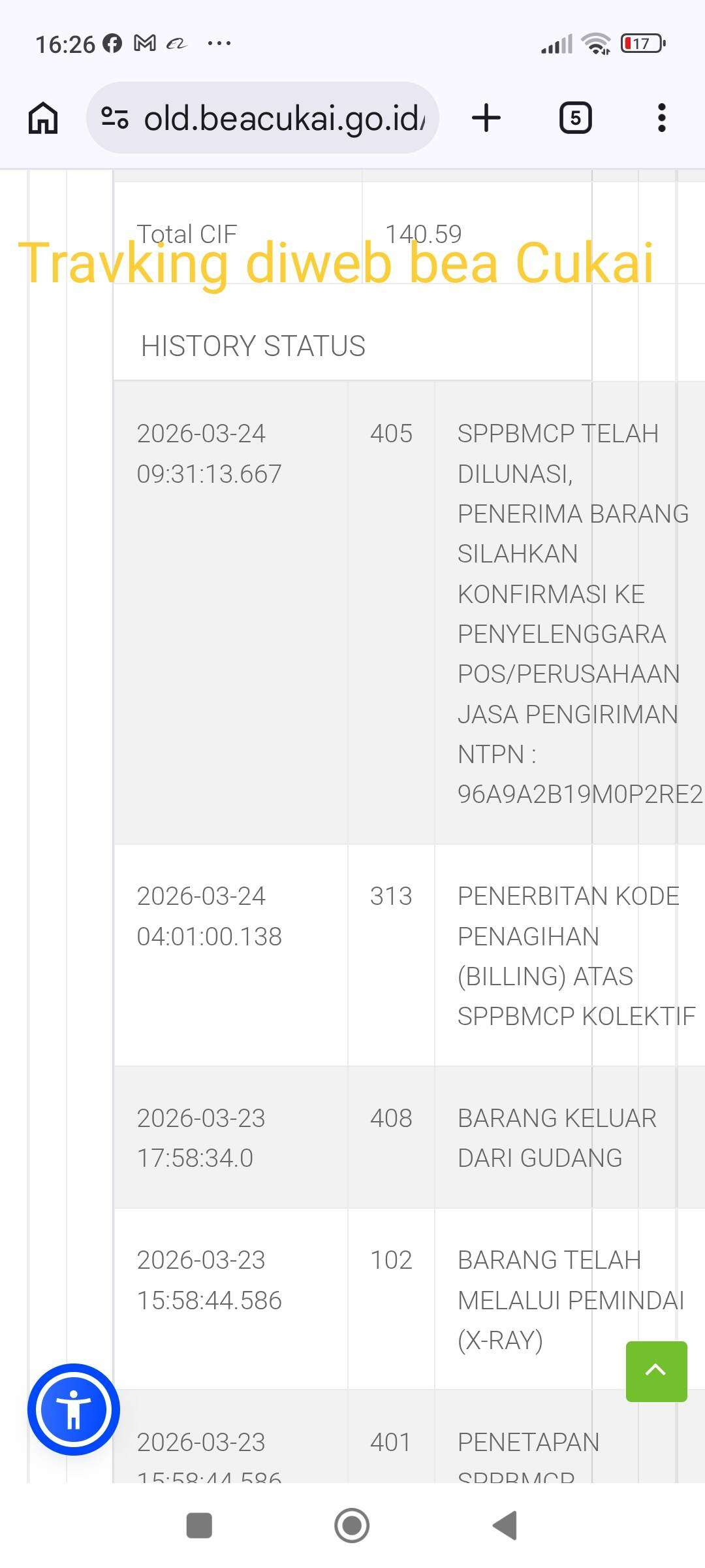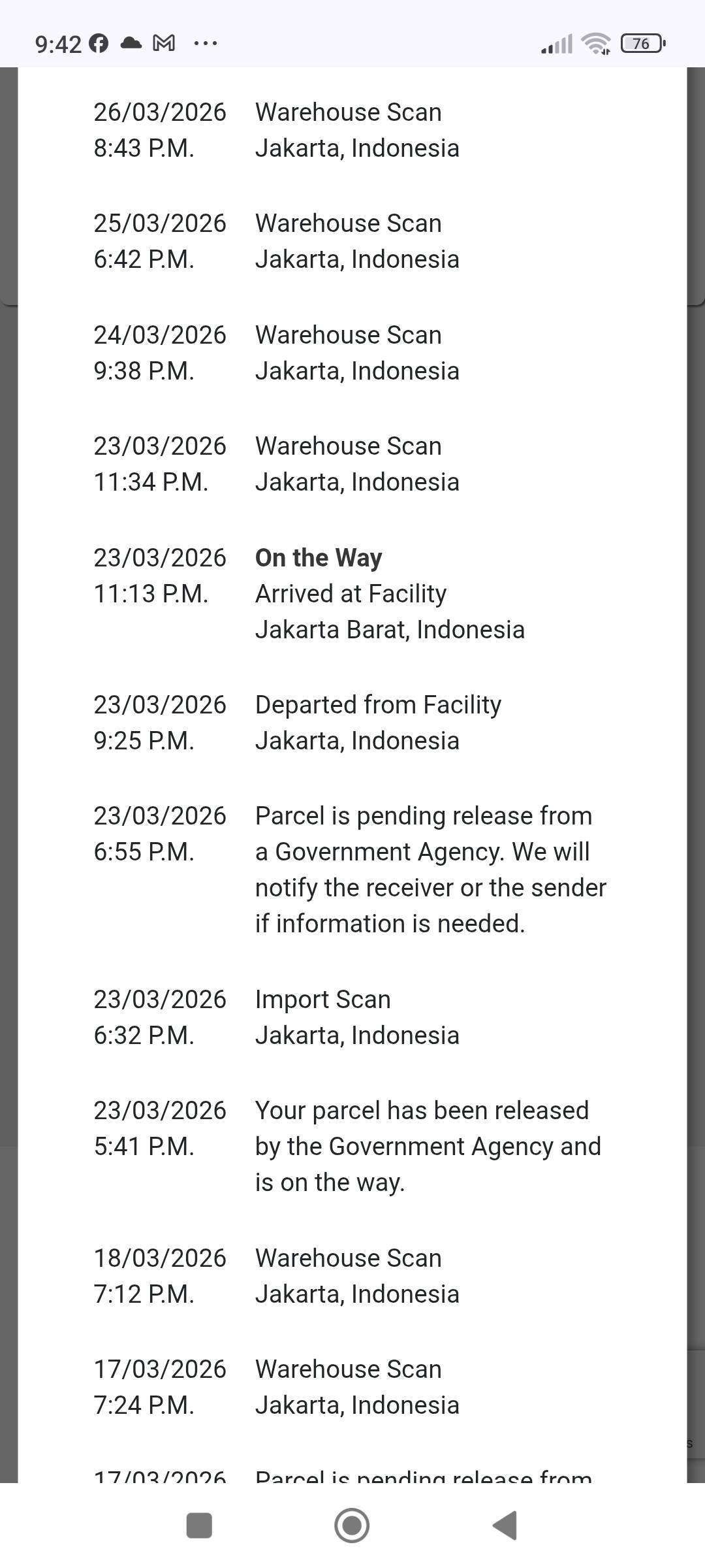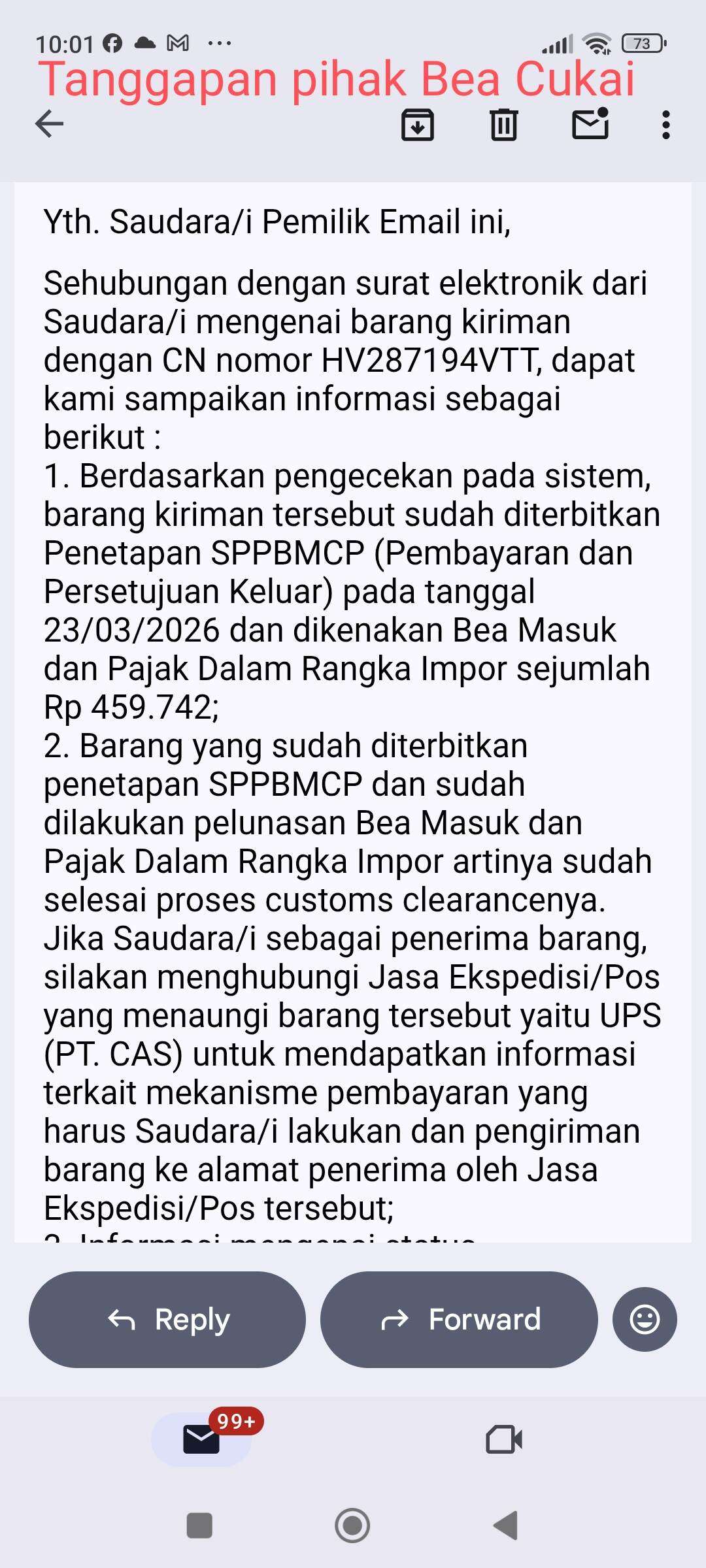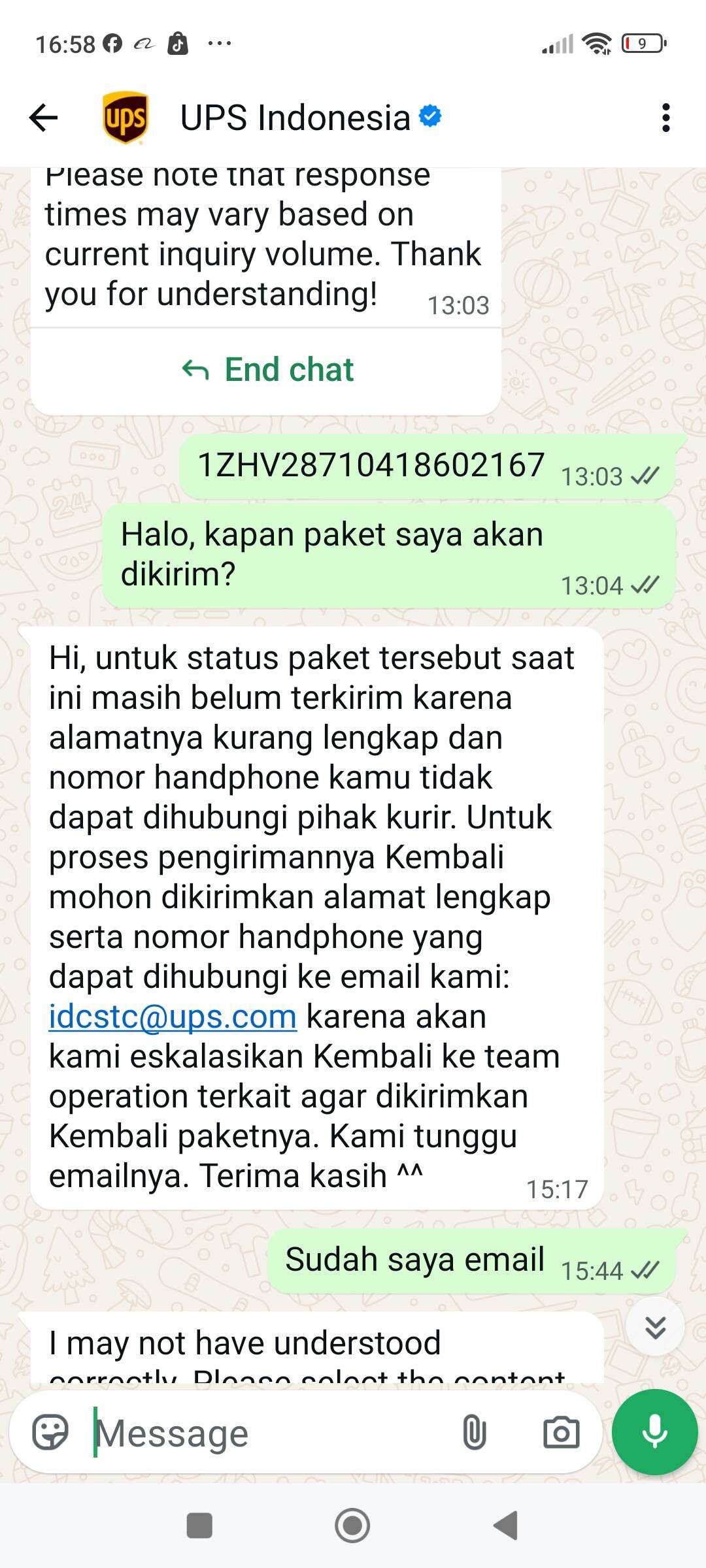 Sudah saya kontak beberapa kali UPS, responsnya mengatakan barang masih diperiksa Bea Cukai. Tanggal 22-3-2026 chat WA UPS mengatakan paket belum bisa dikirim karena alamat kurang lengkap, lalu saya lengkapi. Namun saya tanya lagi ke CS UPS, paket masih diperiksa Bea Cukai.