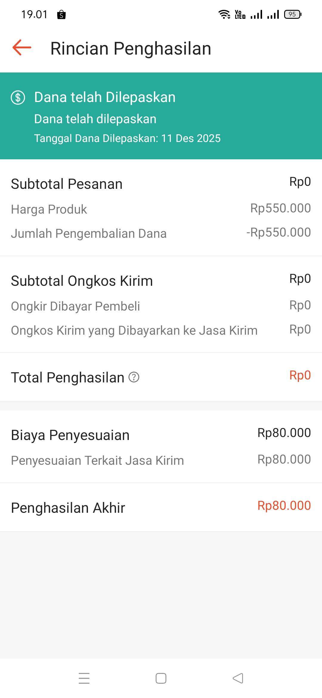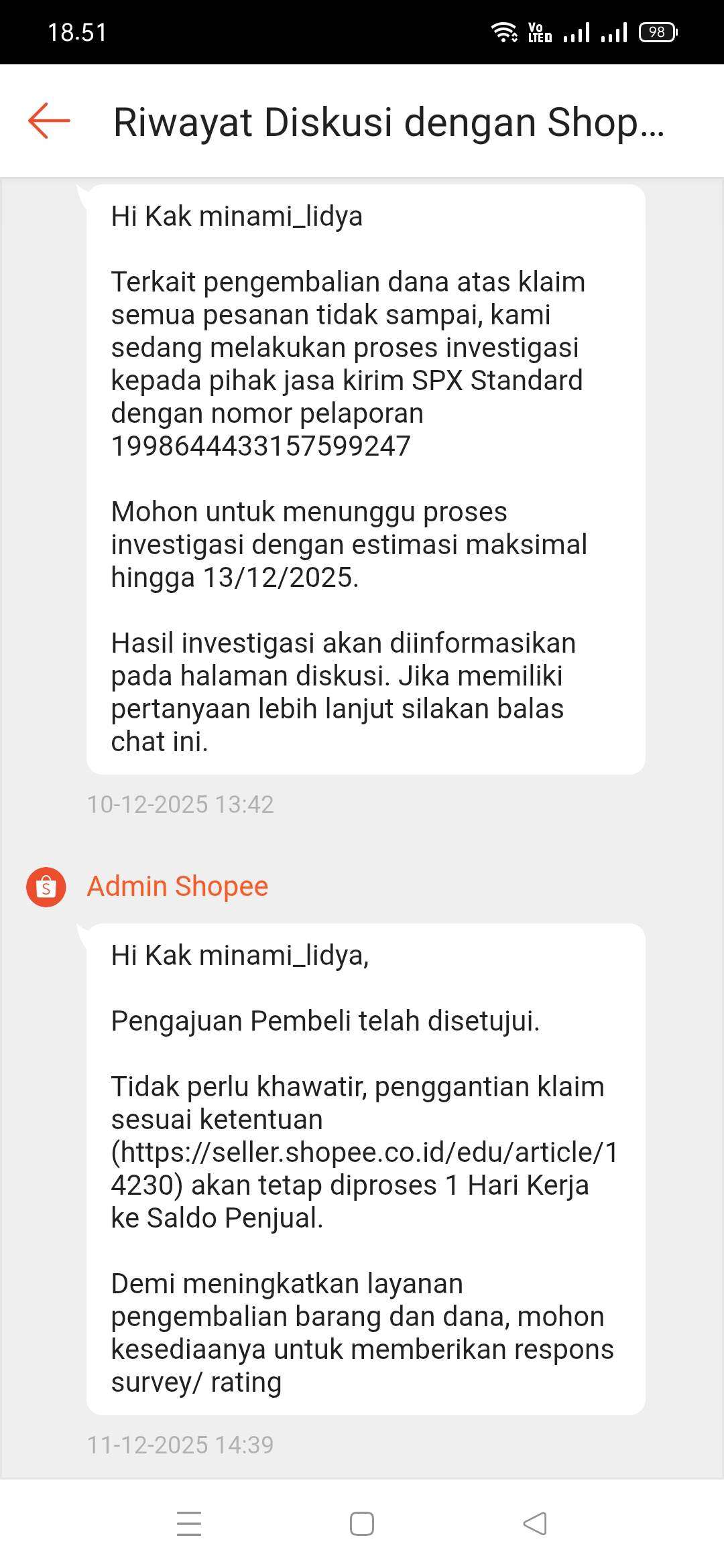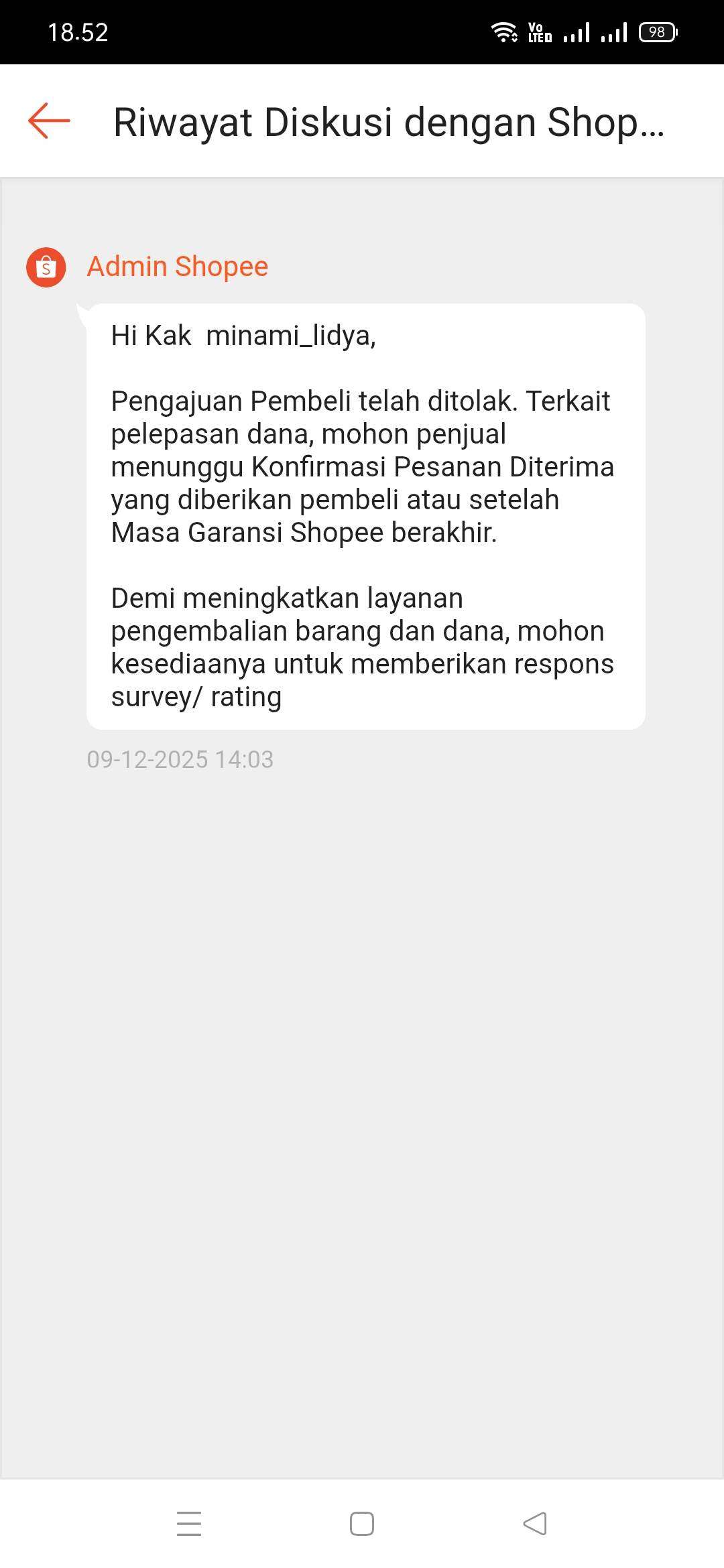 Tanggal 10 Desember Shopee menolak komplain tersebut, dan pembeli kembali mengajukan komplain lagi. Pada tanggal 11 Desember 2025, Shopee menyetujui komplain tersebut dan memberikan saya kompensasi 10 kali ongkir, yaitu sebesar Rp80 ribu.