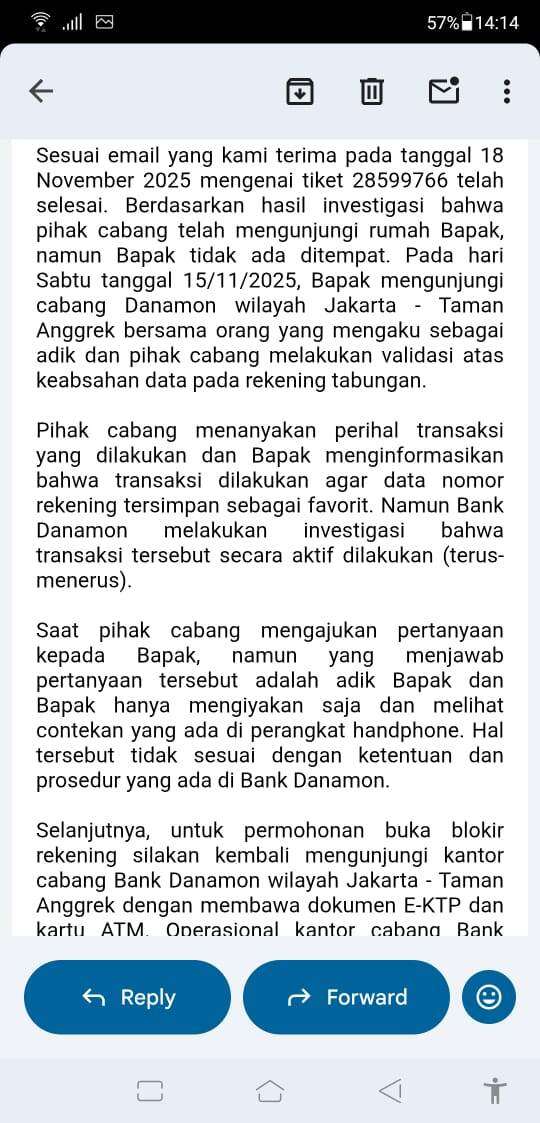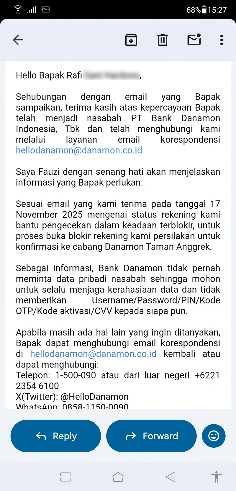 Update (26 November 2025): Surat pembaca di atas kembali mendapat tanggapan dari pihak Bank Danamon sebagai berikut: