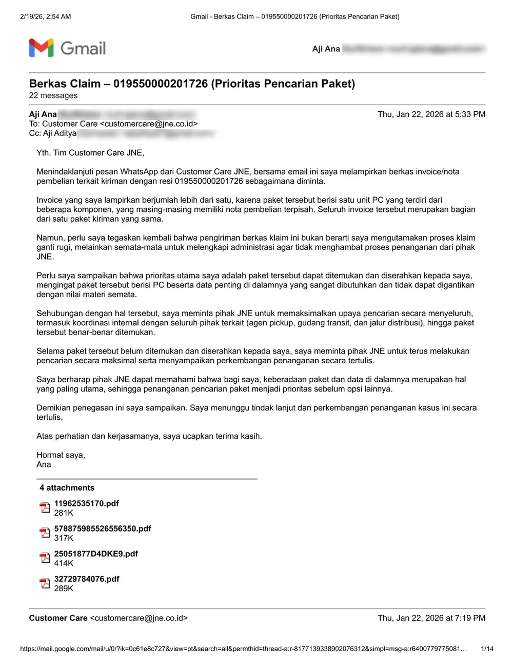 Pada hari yang sama, saya mengirimkan pengaduan konsumen ke YLKI dan menyalin (CC) email tersebut ke pihak CS JNE. Namun saya justru menerima balasan dari CS yang menyatakan proses klaim masih berjalan, padahal email tersebut bukan ditujukan kepada mereka dan saya tidak pernah menyetujui klaim. Hal ini menunjukkan tidak adanya ketelitian CS JNE dalam membaca pengaduan konsumen.