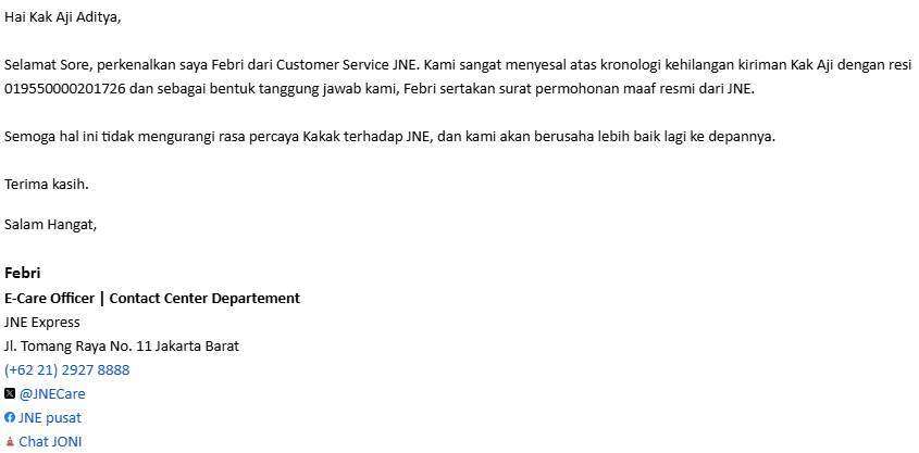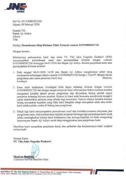 Pada 10 Februari 2026, saya menerima surat permintaan maaf dari JNE yang disebut sebagai bentuk tanggung jawab. Surat tersebut saya tolak karena saya membutuhkan penyelesaian nyata, bukan sekadar permintaan maaf. Balasan penolakan saya juga tidak mendapat tanggapan.